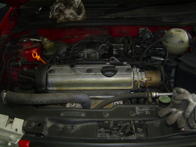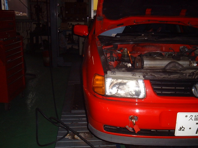 VWポロがエンジンかからないと電話あり引き取りに、すでにロードサービスで牽引して自宅まで運んであり、ロードサービスの方の話ではバッテリーは異常はない、スカスカした感じなのでタイミングベルトではということでしたようです。早速タイミングアッパカバーを外して、タイミングベルトを確認。見た目は張りも合ったのですが、セルを少し回してみるとカムシャフトスプロケットは回りません。恐らく歯飛びじゃないかと思いました。積載車で工場へ搬送し、カバーをはぐるとクランクギヤのところの歯が飛んでました。エンストの状況を聞くとエンジン始動してバックに入れ3mほど動いた所でエンストしたとのことで通常走行中ではないのでダメージは少ないかと思いますが、最近のエンジンはバルブとピストンが干渉するタイプが多いので心配です。とりあえず、タイミングベルトを交換して感じを見ます。