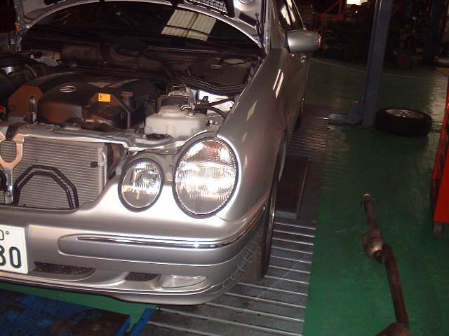 W210型のE240が入庫しました。マフラーから異音が出るとのことでリフトアップしてマフラーを叩いてみると触媒からガラガラ音が出ます。フロントパイプは左右各1本付いています。左側から音が出ているので1本交換しました。また,純正ナビの画面が移らないとのことで確認。TVは正常ですが、ナビやチューナの操作画面は全く映りません。ナビ内部の故障だと思われるのでヤナセに尋ねるとリビルトで約28万円するそうです。あまりに高額なので今回は修理しません。