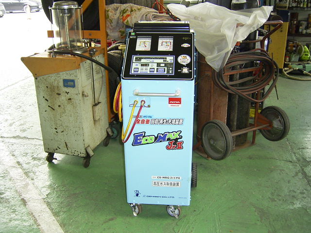 とうとう機械を入れました。デンゲン製のエアコンガスクリーニング機、エコマックスjr2を導入しました。R134ガスになって前のR12みたいにサイトグラスでガス量を確認するのではないくて量で管理するようになったいるので、不便さを感じていました。また、ガスは入っているのに冷えが悪いといった症状が多いので、機械を入れました。もう大分昼間はあったかくなったのでエアコンを入れる機会が多くなって来ましたので早めに入れました。