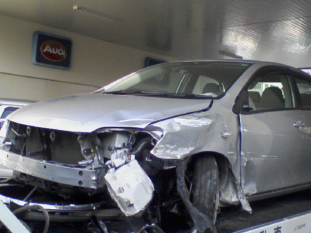 朝8時から携帯に電話があり、従業員が事故しているんでレッカーしてくれと依頼がありました。東脊振トンネルの手前のカーブで事故っている。積載車で早速現場へ。100mほどガードレールに擦りながら来て橋の欄干にぶつかり止ったようです。車は全損です。ミッションケースも割れてます。