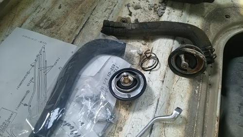 サンバートラックの水漏れ修理。エンジン上部のウォーターホースの破損。ホースとサーモスタットを交換。クーラント交換してエア抜きしますが、ものすごくエアが抜けにくいんですよね(^_^;)