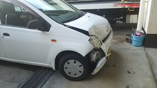 ハイゼットのホーン修理。ホーン本体の不良です。ミラの事故車両もレッカーされてきました。全損ですかね(。>д<)