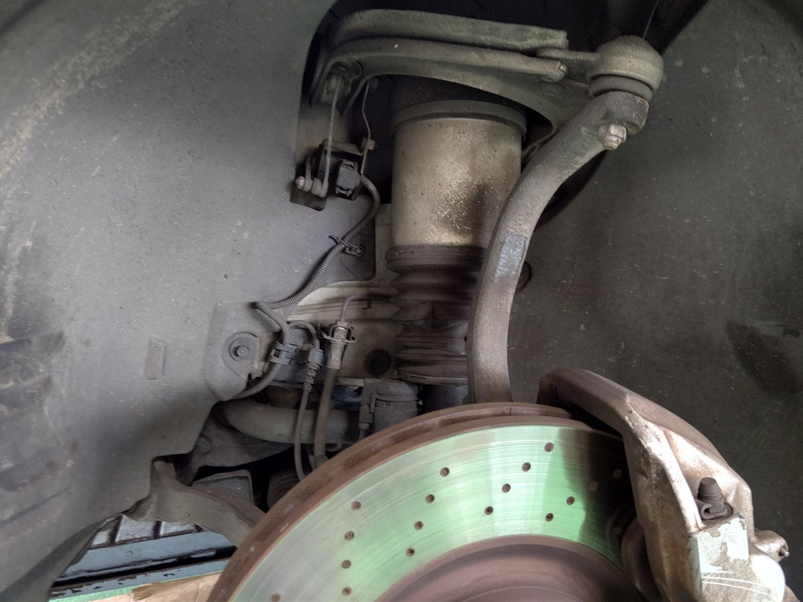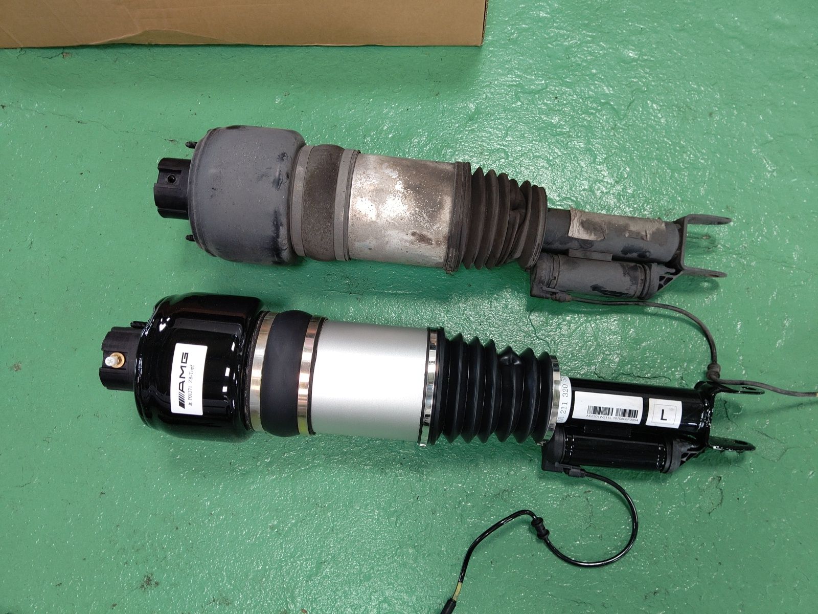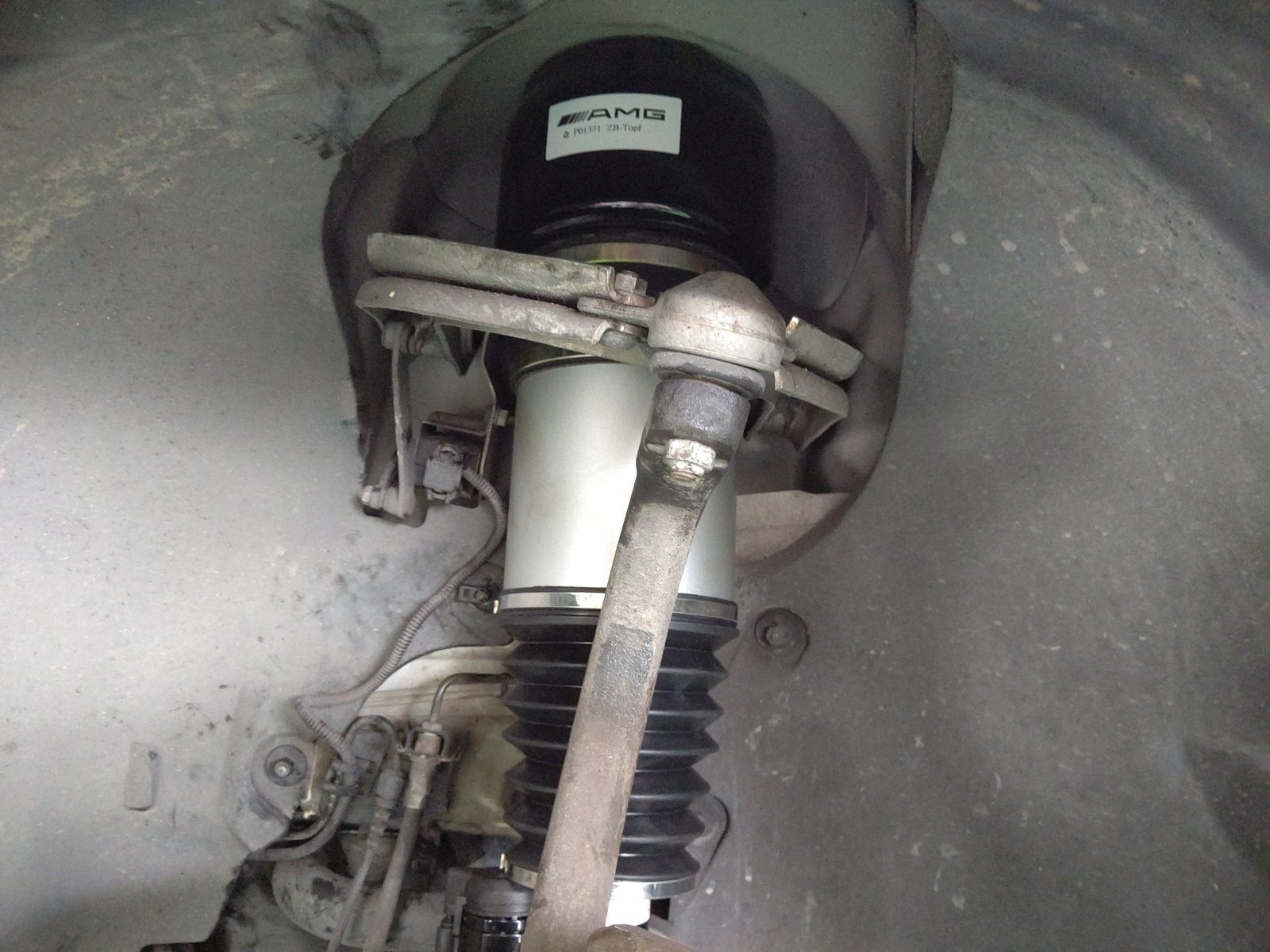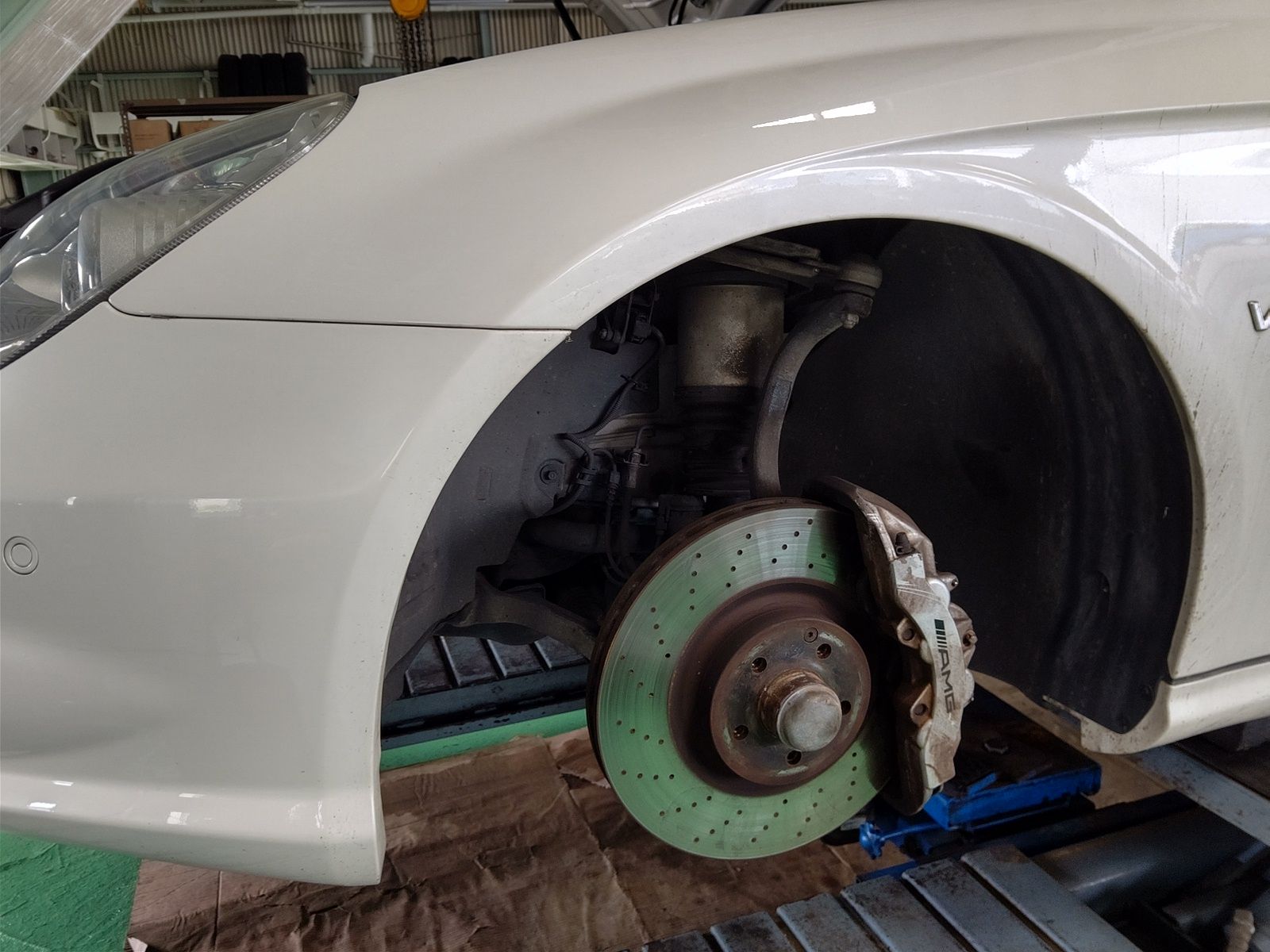 W211型ベンツ入庫。左前の車高が上がらないと同業者からの依頼です。