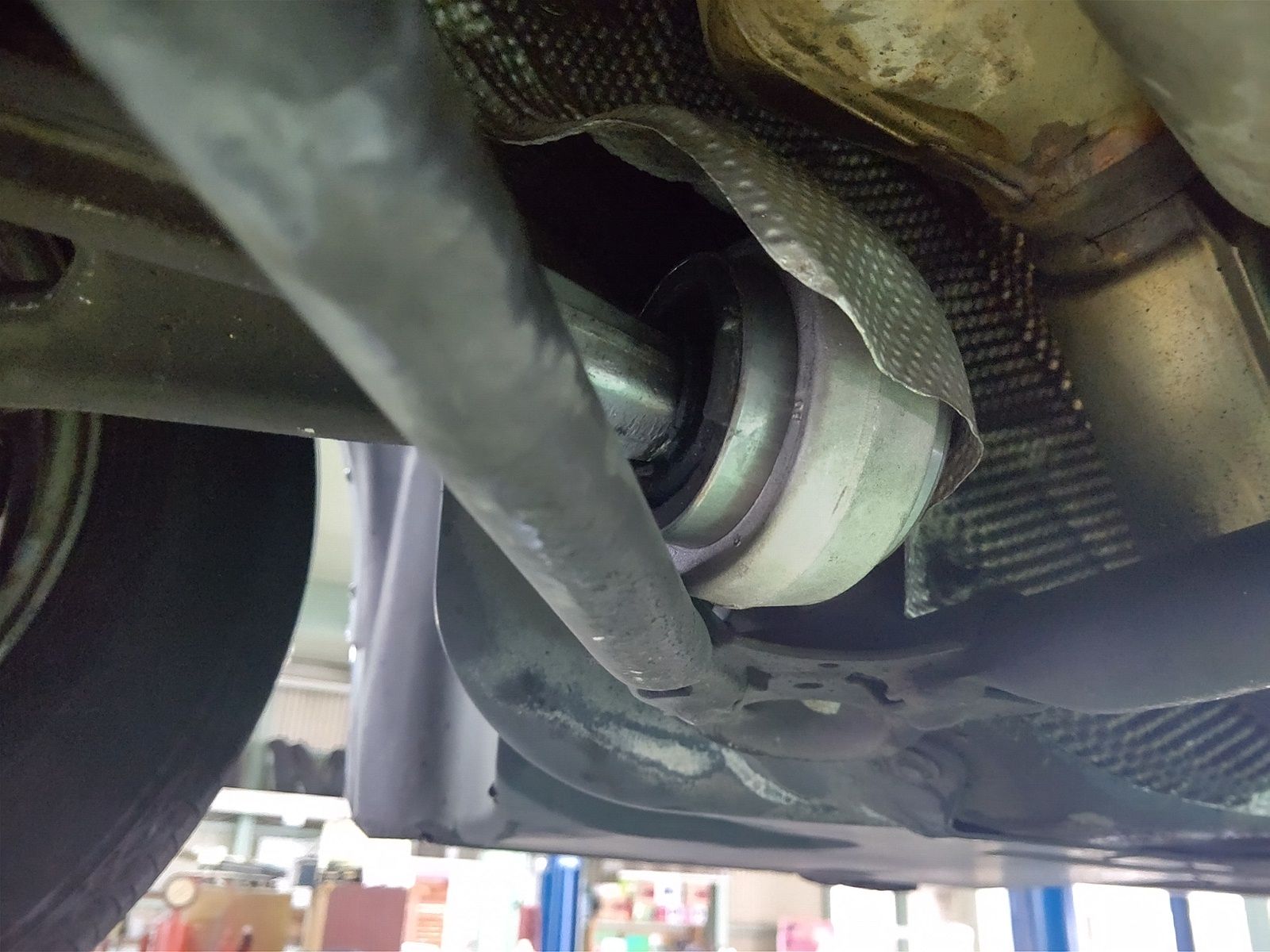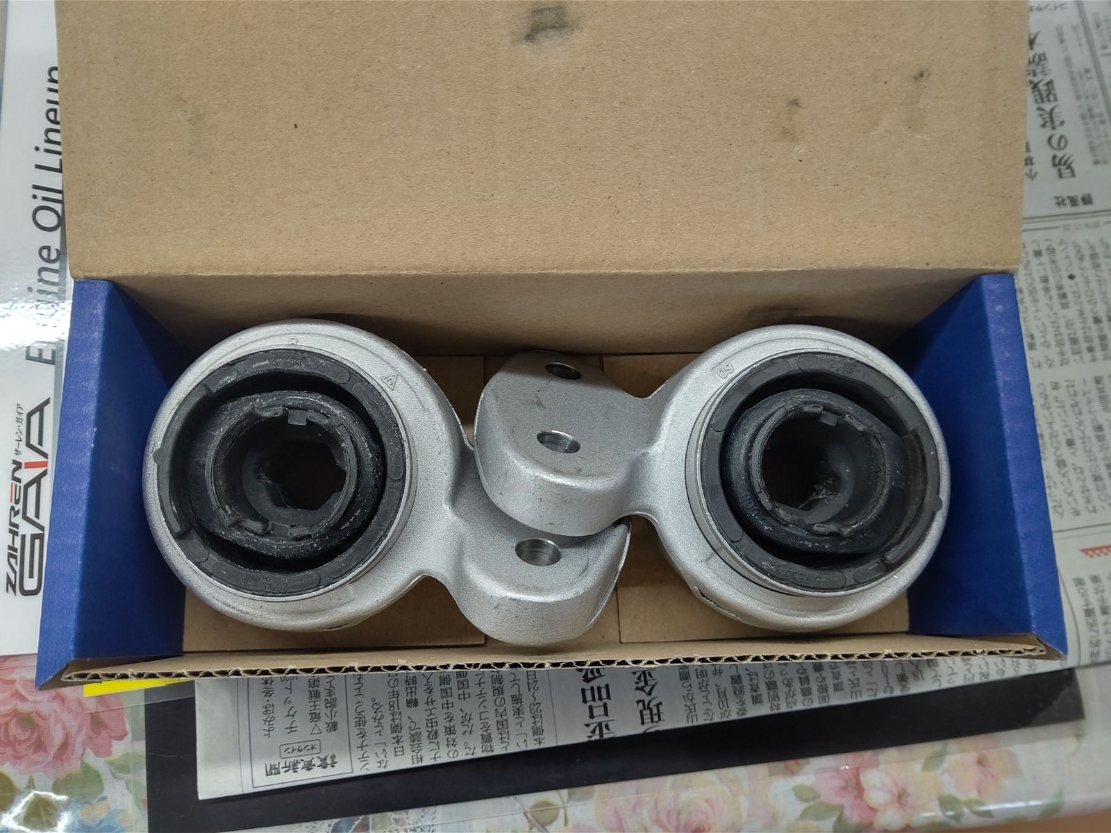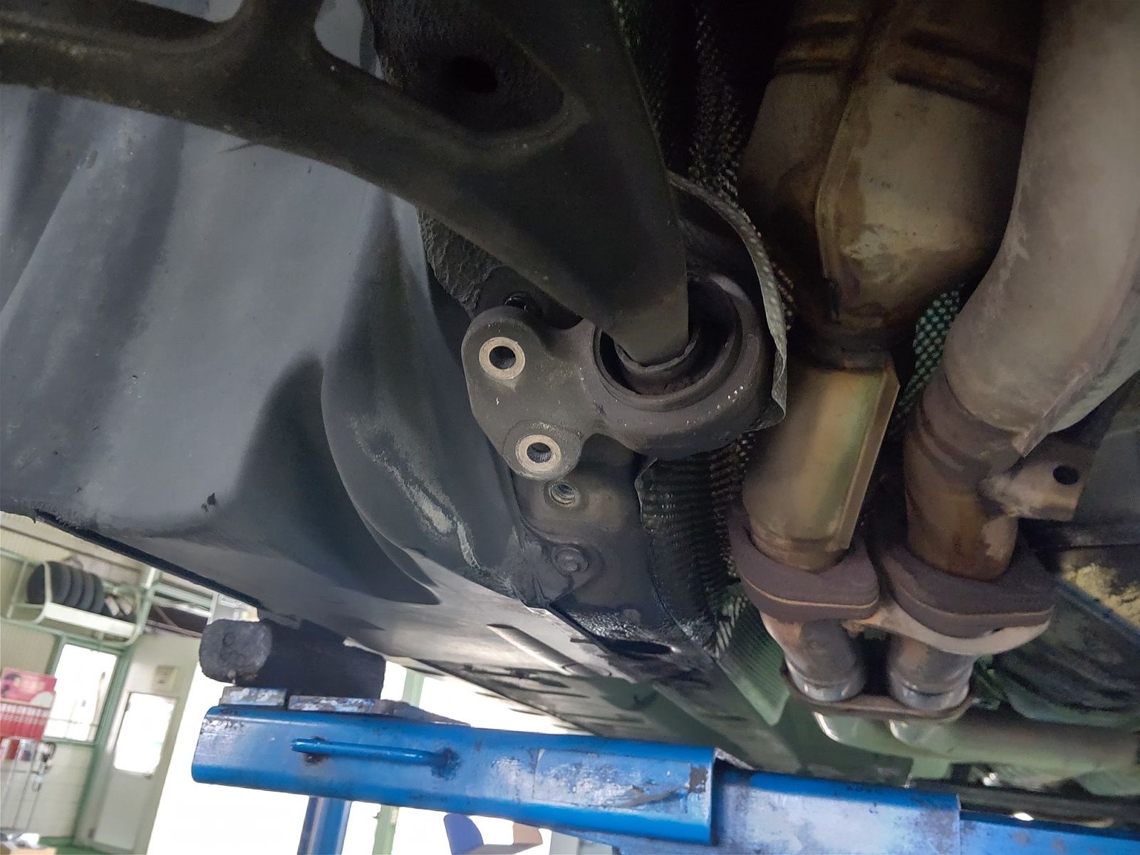 BMW320iの車検整備。ブレーキング時にガツンとショックがあります。フロントロアブッシュの摩耗です。ロアブッシュを両側交換し、ブレーキング時の不快なショックが無くなります。