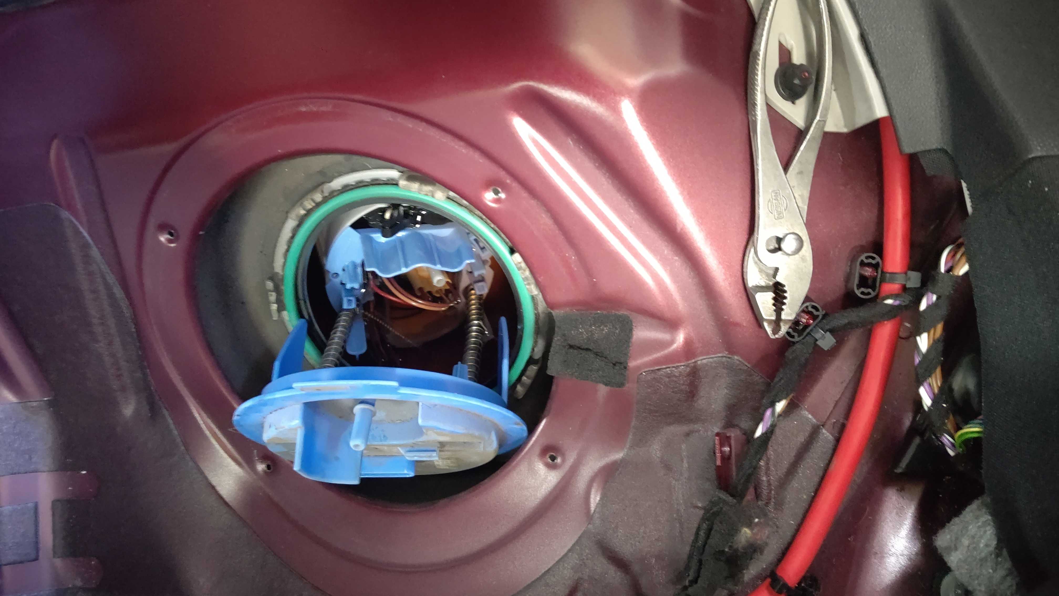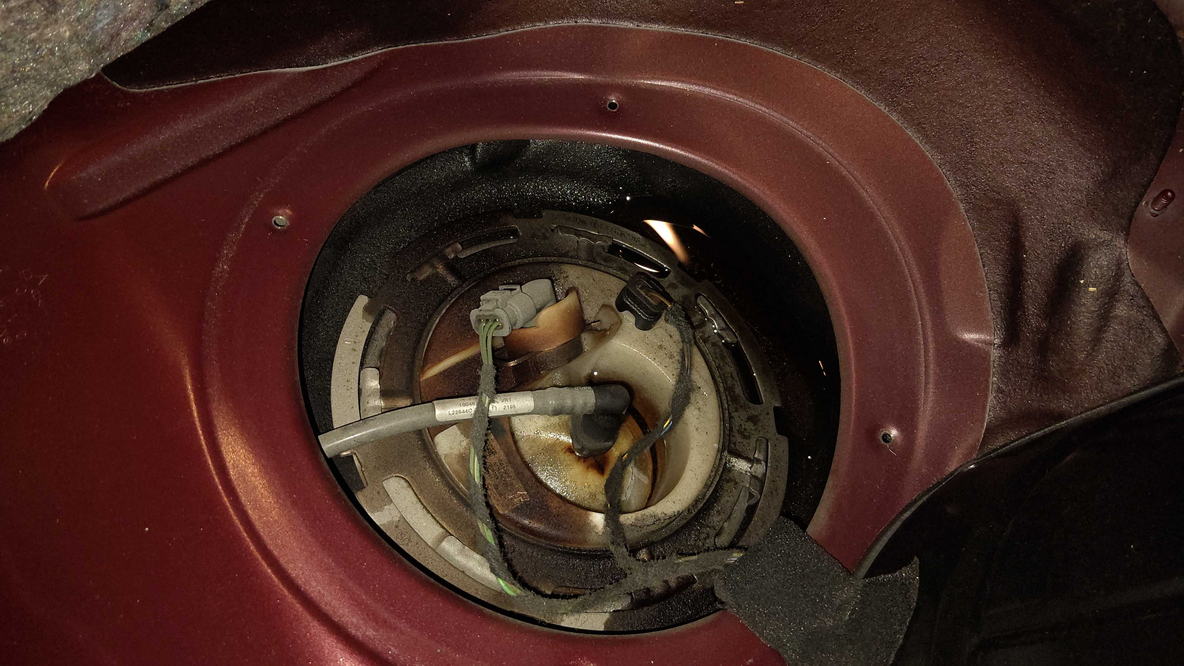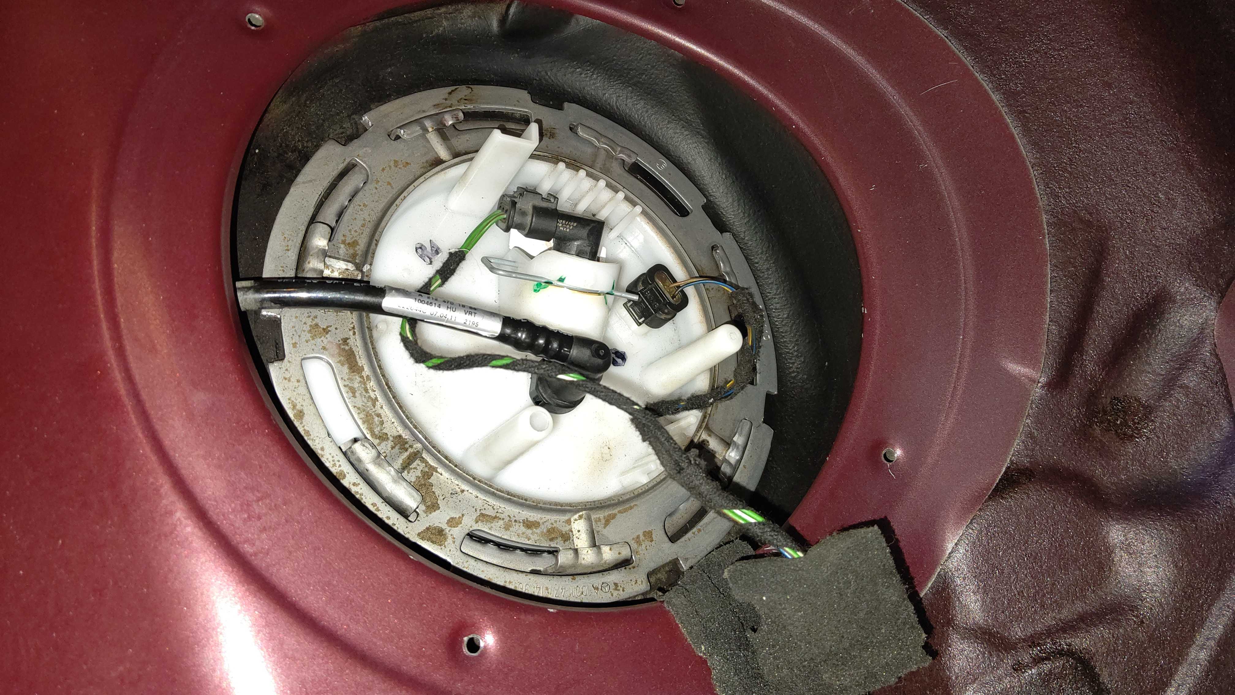 燃料タンクユニットを点検。左側のセンダーユニットから燃料漏れがあり、溜まってます。カバーに劣化により亀裂が入っています。右側のフューエルポンプは漏れなしです。