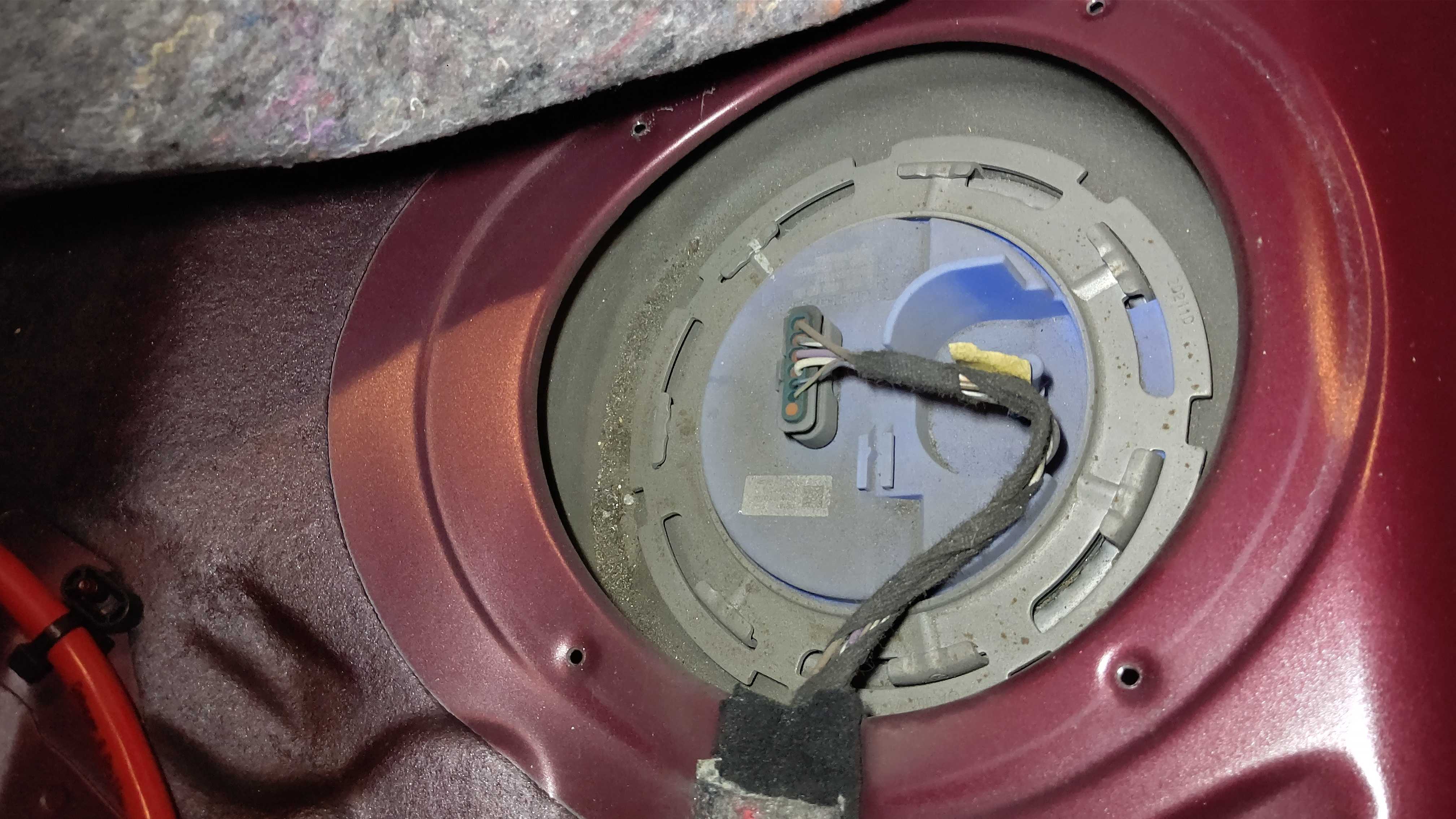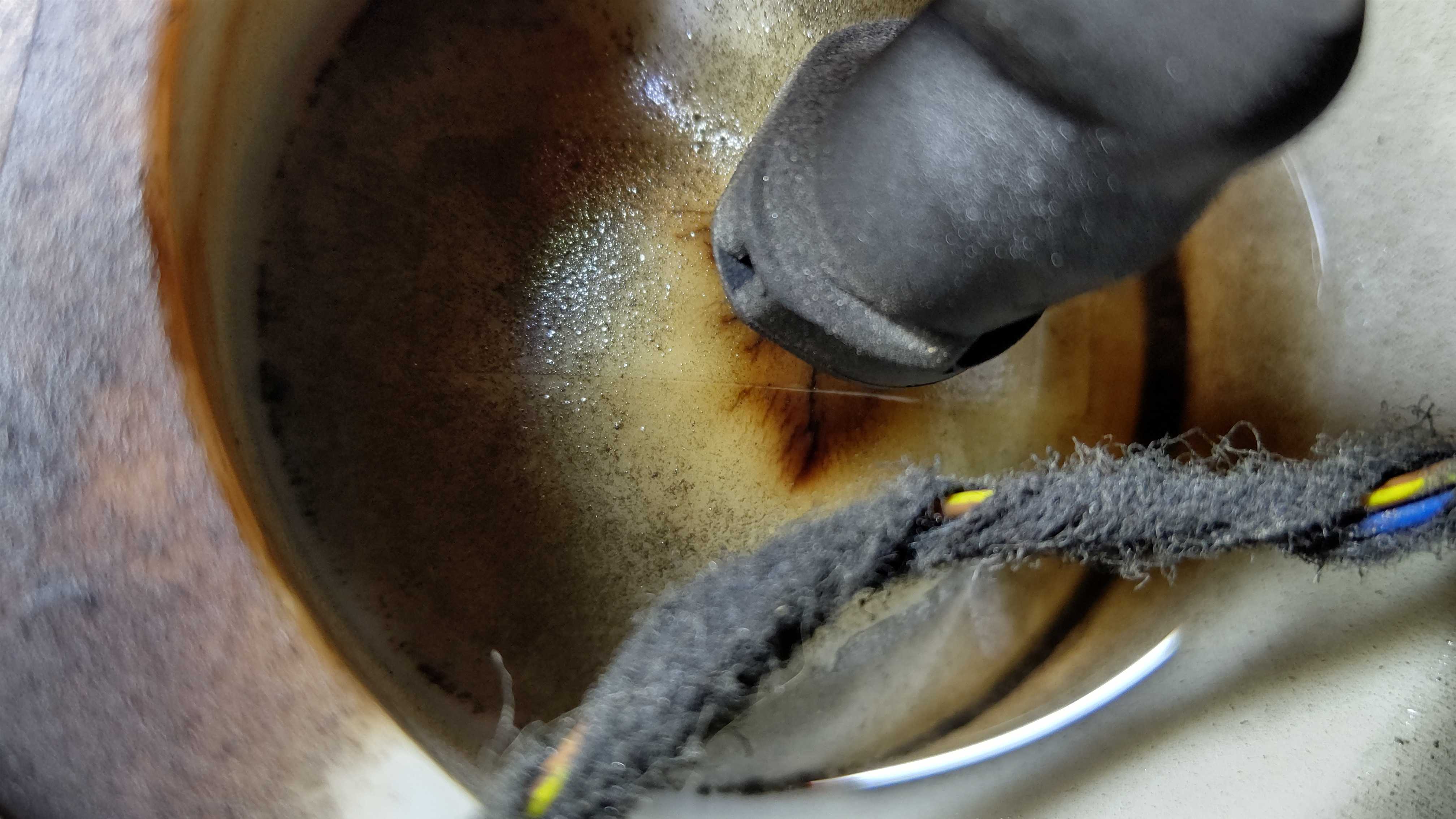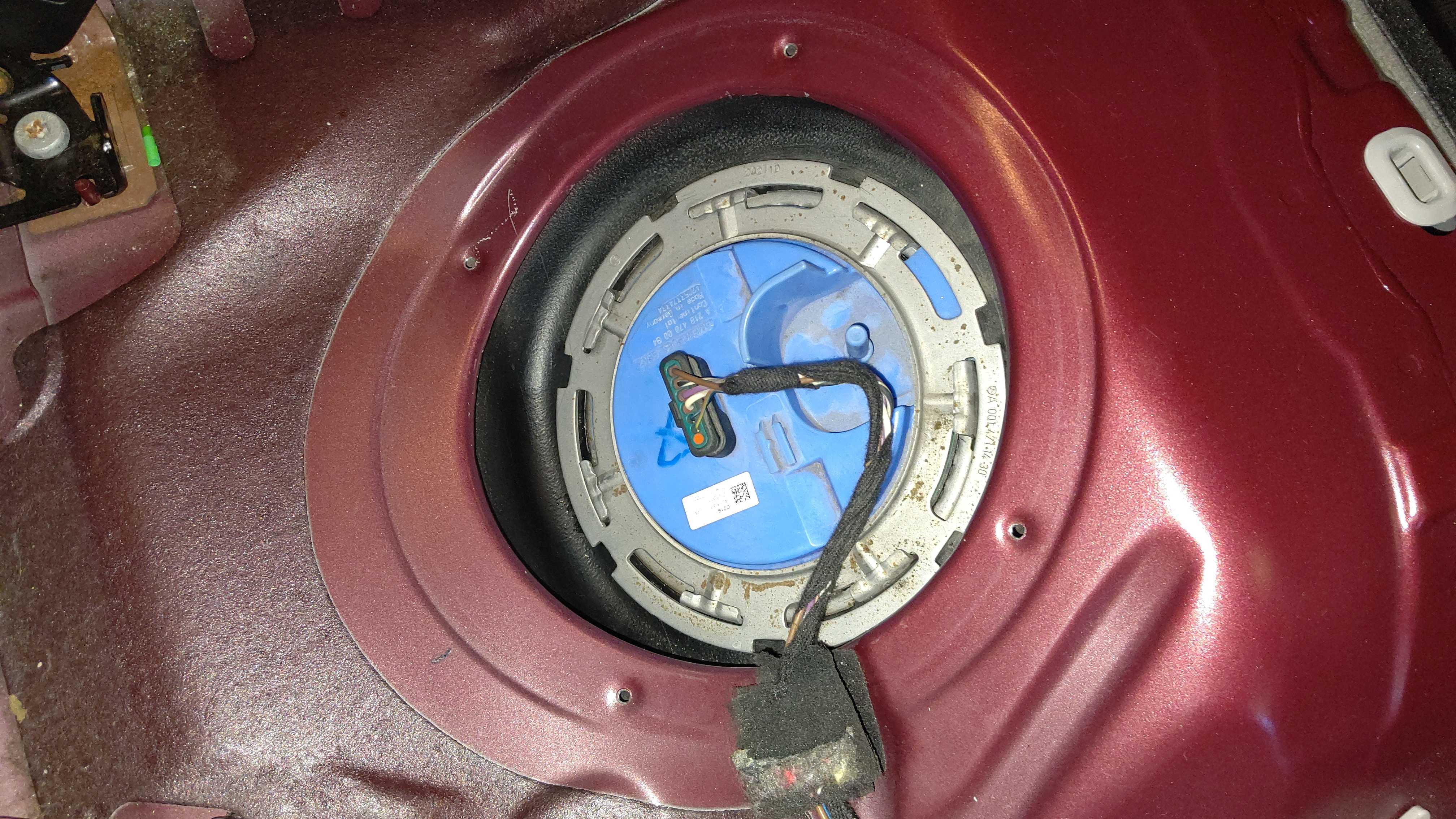 燃料タンクユニットを点検。左側のセンダーユニットから燃料漏れがあり、溜まってます。カバーに劣化により亀裂が入っています。右側のフューエルポンプは漏れなしです。
