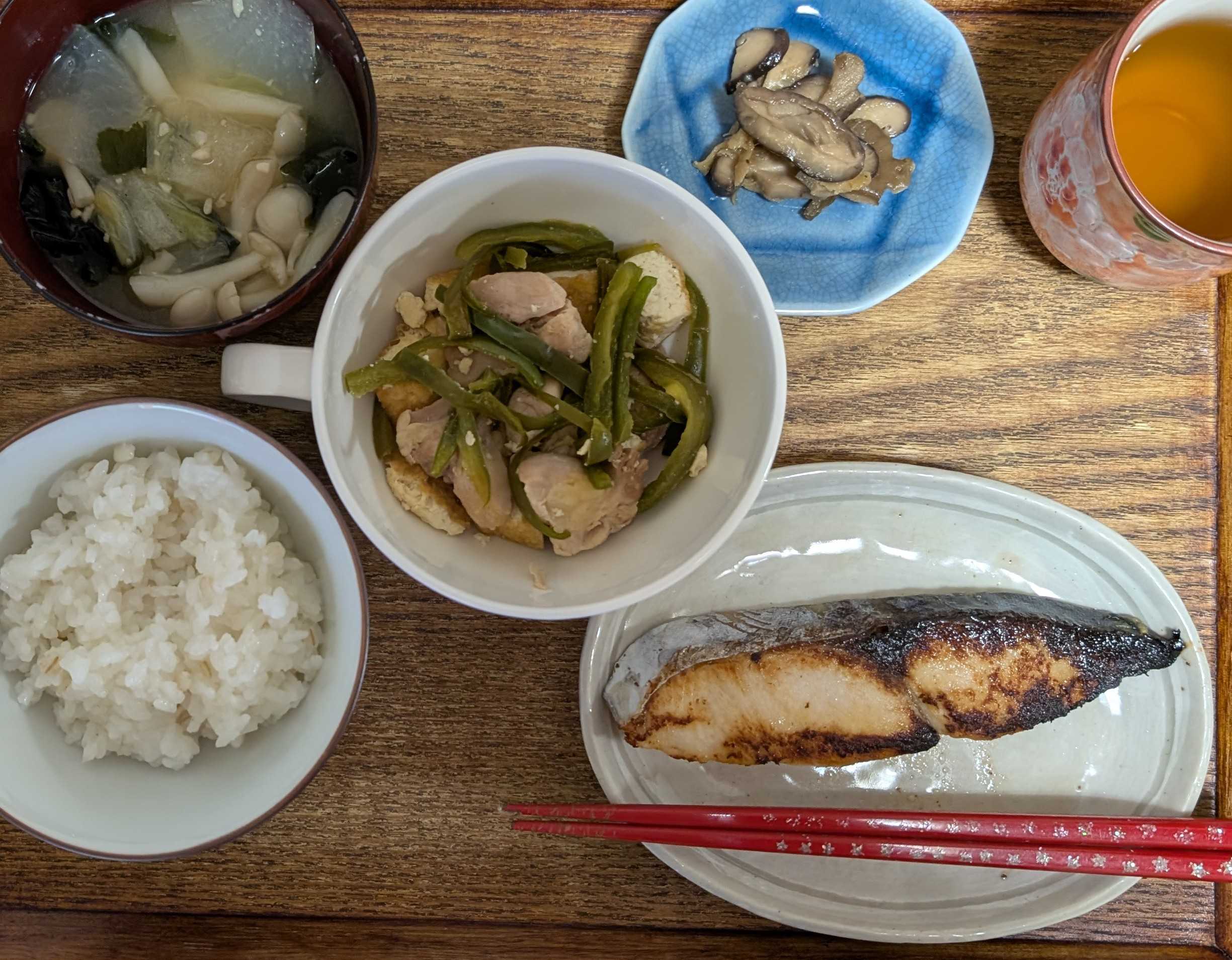 寒い朝、5時に起床するが真っ暗だ〜😱この日、朝は窓ガラスとサッシを拭き掃除をしたついでに台所の換気扇掃除もする洗濯物は雨が降り3日分もたまったままになっていたので一気に洗う冬物を出して衣類の点検をしていたら、ズボンが少しカビ臭いので洗う事にした午前中はここまでしか出来なかったいわゆる小掃除だ本当はドア部分も拭いたりしたかったが、気持ちがついていけない〜🤣そんな午後は腹式呼吸とカラオケ練習、英会話レッスンと読書、プチ稼ぎ等をしたカラオケを歌ってみたら昨日よりは声は出ていたので、やはり毎日歌うと上手くなるのかと思った😃なかなか覚えられないのは英会話だ〜🥲毎日やっているわりに、単語のスペルを間違えたりする。どうやったらスペルを間違えずに書けるのだろうか?学生時代は得意だったのに…老化現象かなあ〜🤣🤣💦でも好きだから頑張ろう〜っと😃👊この日の夕飯↓味噌汁は白菜とキノコ、大根、ワカメ魚はサワラのみそ漬け、ピーマンと厚揚げ、鶏肉の炒めもの、小さい小鉢は生姜と椎茸の佃煮ですそしてご飯は白米ともち麦のごはんお茶はゴボウ茶でした〜私はそんなに料理が上手くないよく小学校の友人から言われた事もあった切り方が違う〜カレーを作るときはそんな切り方はしないよ〜なんて言われたカレーを作る時に玉ねぎの切り方なんてあるんだろうか?普通に切っても、ダイナミックに切っても、細かく切っても良いじゃないかと…そんな時から料理は苦手意識があった🥲見た目じゃないよ〜美味しく食べられたらそれで良いじゃないのか〜と今は思っているいつも有難う御座います報恩感謝