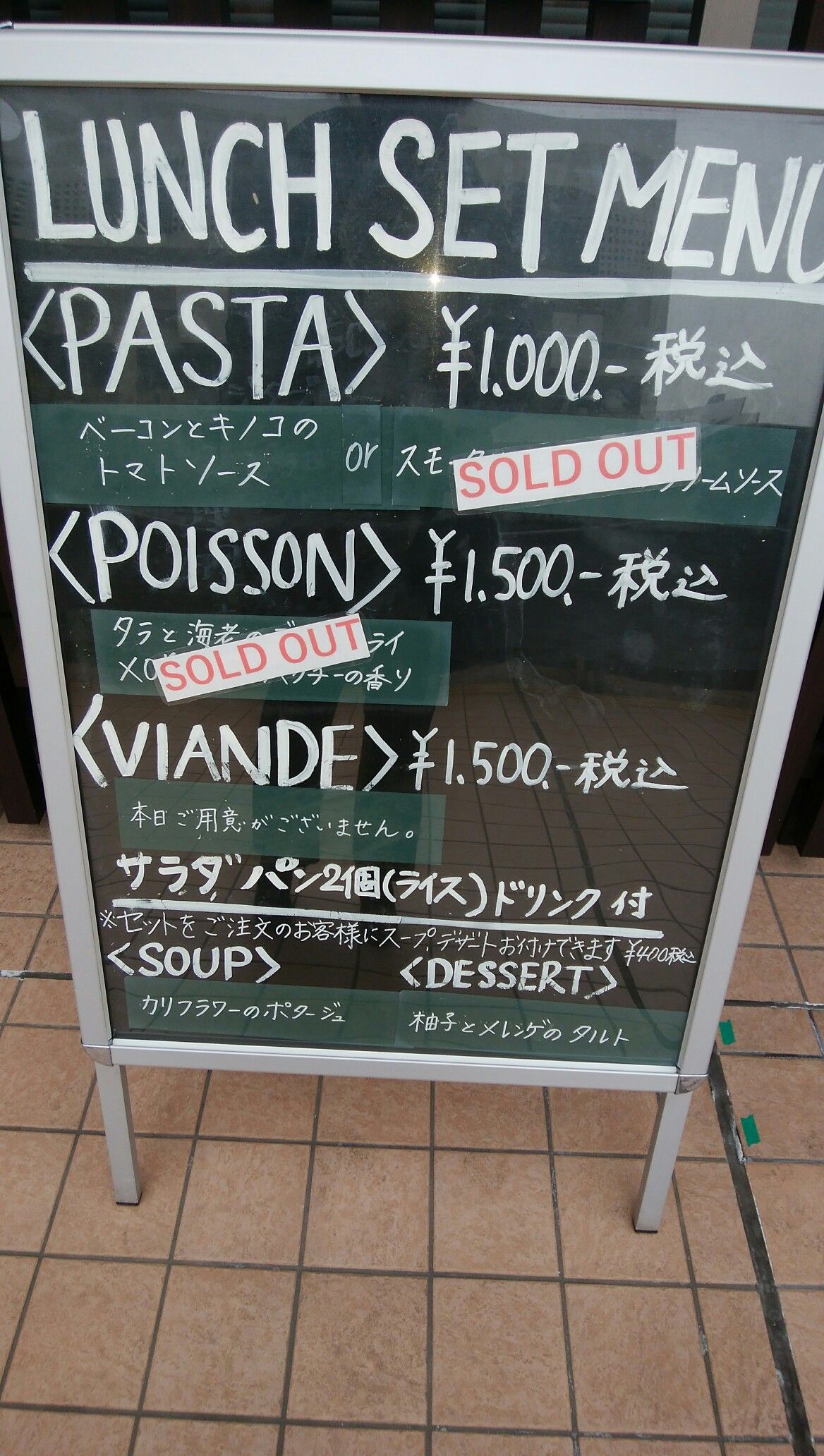 お友達と3人でランチに行く予定だったが 一人はこどもが骨折して 病院に行ってから学校に連れて行くので✖ もう一人はこどもが腸炎でそれが移って 体調不良(T_T) 予約はキャンセル 課外の参観もあったので 早くに行っても待ち時間が 勿体ないので ラストオーダーの少し前に行って 一人でランチ しまった~ お肉が売り切れていた!! ショーック(T_T) 早く行っていればと思いつつ パスタは好みの食材ではなかったが美味 デザートが残っていたので注文 今日もおいしゅうございました♡