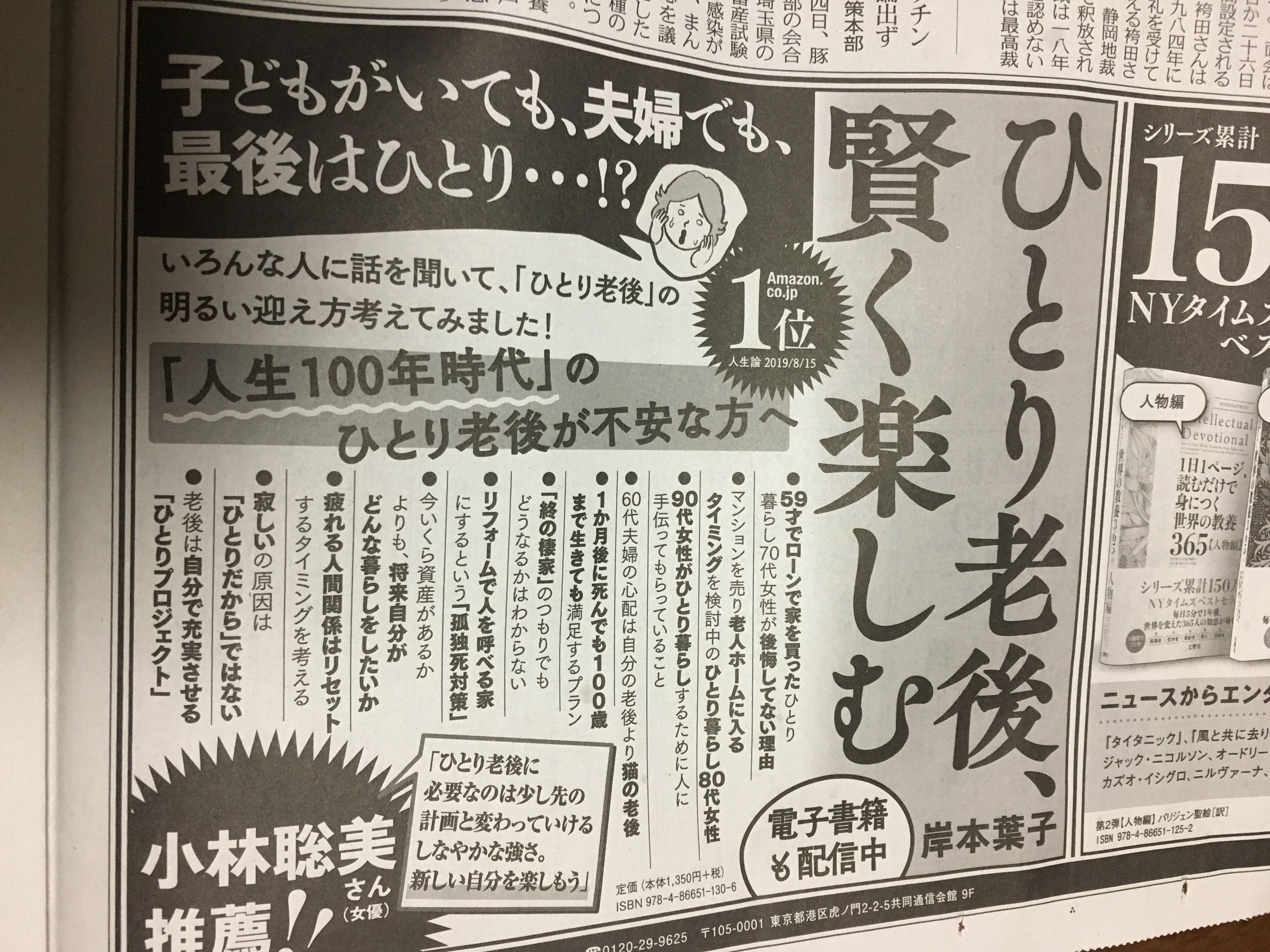 今朝の新聞の本紹介欄が気になりました。『ひとり老後、賢く楽しむ』なんていう題名がついています。ひとり老後。。。。気になる言葉です。先日も友達と「老後どうするん?」とやらの会話をしたところです。暗い話だなとも思いますが 不安もありで・・近頃はおひとりさまが多いとか。。。。気にやんでも仕方がない。まずは健康第一!!どう生きたいか。らしい。。。