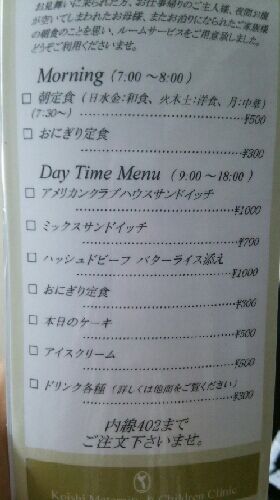 夜中のぎっくり腰から朝まではゆっくり寝られました が、仰向けに寝てたので腰が痛くて起きれない… 旦那さんに手伝ってもらいながらトイレへ お部屋にトイレが有るのでどうにか行けました そうこうしているうちに看護師さんが様子を見に来ました 食事は昼までは旦那さんが居るのでお部屋食にしてもらい、夜のお祝いディナーだけは頑張ってレストランでみんなと食べたいと伝えました 一人でお部屋で祝い膳はさみしいもんね そして、旦那さんの朝ごはんをルームサービスで頼みました 朝ごはんはこんな感じで曜日ごとの朝食セットとおにぎりが選べます 今日は洋食の日なので私と同じメニューで、エッグベネゼクトです さらに旦那さんは午後から仕事なのでおにぎりもオーダーしました 確かに男の人だと少ないかも… 付け合わせのピクルスが、色々な野菜が入っていて美味しかったです♪ 午前中はベビーをお部屋に連れて来てもらいました 旦那さんもいるからね!! ベビーが来るまでの間、着替えを旦那さんに手伝ってもらいすませました 小石マタニティクリニックでは、入院中の洗濯物でパジャマや赤ちゃんのガーゼ、下着類はルーム係りの方が朝集めて午後洗濯をして持ってきてくれます このサービスも助かります ベビーのお世話を二人でしていると、すぐに昼御飯 旦那さんはクラブハウスサンドイッチをルームサービスで 私は スズキの煮物と、蟹爪付きの筍田楽等 お昼も入院患者さんと同じメニューをオーダー出来たらいいのにね って旦那さんが言ってました 確かに、ここは4階のレストランで一般の方も食事ができます メニューはルームサービスのメニューと同じです 前回の妊娠で食べつわりだった時、健診の待ち時間にどうしてもお腹すいて食べに行ったことがあります 予約なしで待ち時間が長いときに受付でドリンクチケットを頂いて、レストランでドリンクを飲みながら待つことも出来ます 今日の夜ご飯はお祝い膳ですが 外は台風の影響か、すごい風 明日の退院大丈夫かなぁ… おやつは羊羮3種類でした いも羊羮2種類と普通の羊羮 甘さ控えめで、さっぱりしたかんじ 今日でおやつはおしまい 退院の日はお昼ごはん迄なので あぁ、帰りたくないような 帰りたいような…