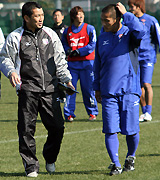 J1昇格後、初の全体練習。横浜市港北区のしんよこフットボールパークにはフィジカル走で先頭を走るなど、チームを積極的に引っ張るカズの姿があった。そのキングが、“エースFW”の座を久保に託した。「久保には『チームを引っ張っていってくれ』と話した。彼は代表経験もあるし、横浜Mで優勝もしているからね。」魂のプレーとサッカーに打ち込む姿勢で横浜FCに昇格をもたらしたキングの説明に、思わず力がこもった。前日の新入団発表での久保の弟子入り志願を受けて、「体の手入れのこととかを話した。」と、カズはさっそくアドバイスを送ったことを明かした。寡黙でマイペースな久保は、先頭を切って走ったカズとは対照的に最後尾でランニング。「少し抑え気味にやった。」と言うが、“師匠”に関しては「あれだけ体を作っているのはすごい。」と驚嘆の表情を浮かべた。2000年6月6日、日本代表のジャマイカ戦(モロッコ)で2人は15分間、一緒にプレーしている。それから6年半。再び、同じピッチに立つ。「久保とは代表戦以来だったけど、あまり距離感は感じないね。とにかく彼には100%の力でプレーしてほしい。」とカズ。新たな師弟コンビ、キング&ドラゴンが今季J1の台風の目になる。・・・おとなしい久保の精神状態を緩和させ、チームに溶け込めさせたのは、やはりKAZUだった。たわいもない話でも、緊張している久保には、心を開くきっかけとなったはず。KAZUのプレー以外での存在感は、やはり大きい。サッカーに対する直向きな姿勢だけでなく、チームメートへの配慮も。さすがは、KAZU!!久保が、一日も早くチームに馴染み大爆発することを期待したい。それが、横浜FCのJ1での大活躍に繋がるはずだから。・・・
