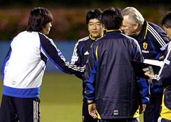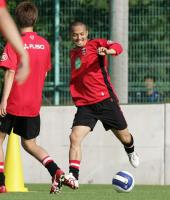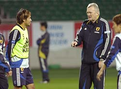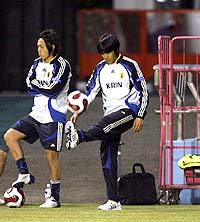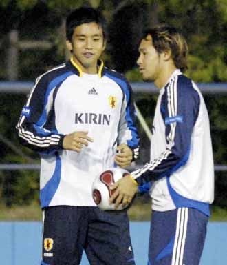期待の中村俊は右足首の負傷のため本田とともに室内で調整し、全体練習には参加できなかった。オシム監督にはやや肩透かしのスタートになった。3連覇を狙うアジア・カップに向けて、中村俊と周囲の連係を早く高めたいところ。オシム監督は「やらせたい練習があったが、けが人に無理やりやらせるわけにはいかない。重傷でないことを祈りたい。」と残念そうだった。・・・オシム監督と俊輔の握手!!どんな会話が交わされたんだろう。ちょっと、気になる。それはさておき、やはり、俊輔は、別メニュー調整となった。右足の捻挫は、重症なのかな。早く治ることをオシム監督同様、祈っている。・・・