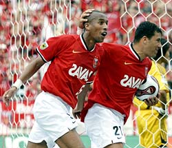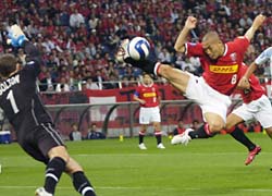 サッカーのアジア・チャンピオンズリーグは23日、埼玉スタジアムなどで1次リーグ最終戦を行い、E組の浦和はシドニーと0-0で引き分け、勝ち点10の同組1位で1次リーグ突破を決めた。浦和はワシントンや小野らがゴールに迫ったが、最後まで得点を奪えなかった。しかし、失点も許さず1位を確保した。・・・今、今、試合が終わった。0-0の引き分けで、レッズが、ACLの予選を突破した。苦しい試合だったが、よく踏ん張った。よく粘った。おめでとう、レッズ!!(試合終了5分後)P・S この写真のゴールシーンが前半で最大に悔やまれるシーンだ。なぜ、小野は、足でいったのか。なぜ、小野は、頭でいかなかったのか。小野に、一瞬の迷いがあったのだろうか。なんにしても、相馬のナイスクロスを決め切れなかった小野。最近の小野は、シュートを打てど、打てど、枠の外のシーンばかりだ。あ~あ、残念。・・・