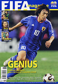中村俊輔が表紙を飾った。国際サッカー連盟の機関誌「FIFAマガジン」サッカー日本代表MFの中村俊輔が、国際サッカー連盟の機関誌「FIFAマガジン」6月号の表紙を飾った。写真は日本代表の背番号10の青いユニホーム姿のもので「GENIUS(天才)」「アジアのトップ選手が欧州を征服」の見出しも躍っている。「本物のゴールデンボーイ」の見出しが付いた中村を紹介する3ページの特集記事も掲載。その中でサッカーだけでなく家族とのエピソードなどにも触れられている。中村は今季、スコットランド・プレミアリーグでチームの2連覇に貢献。個人でもプロ選手協会やサッカー記者協会の年間最優秀選手に輝いた。・・・う~ん、うれしいけど。どうだろうねえ。「天才」的な面も確かにあるにはあるが。「天才」という言葉が大きすぎて、言葉負けしている感が否めない。「アジアのトップ選手が欧州を征服」、こちらもすんなり喜べない。確かに、俊輔は、「アジアのトップ選手」ではあると思うが、「欧州を征服」してはいない。イタリアでは、輝けなかった。そして、ドイツW杯では、散々だった。今季、スコットランドリーグで輝いただけで、「欧州を征服」と言われても、素直に喜べない。まあ、FIFAの機関紙の表紙を飾る栄誉に輝いたことは、それだけの活躍が世界的に認められたという面において、拍手を送りたい。僕の中では、まだ、俊輔は、中田英寿を越えてはいない。・・・