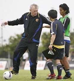夜になっても、なお蒸し暑いハノイ市内。豪州代表の戦術コーチが見守る中、オシム監督は額の汗も拭わず、完全公開の熱血指導を展開した。「でかくてうまいビドゥカを意識しろ!」「ビドゥカは速くない。駆けっこなら勝てる!!」約1時間半の練習中、指揮官は何度も相手エースの名を口にした。イングランドプレミアリーグで活躍する1メートル88の長身FWを想定し、1メートル91の自らが動きも再現。DF中沢と競り合い、クセも伝達した。「内容? シークレットです。圧力は監督の方がありますね。」ドイツW杯で直接対決した中沢は、手応えありの笑みを浮かべた。ジーコ・ジャパンは、屈強なフィジカルを持つ豪州攻撃陣に対し、DFを自陣に引かせて対応しようとした。その結果、相手の勢いを封じきれず逆転負けした。一方、オシム監督はDFラインを高く保つ策を試行。1時間以上も、その戦術練習に時間を割いた。GK川口は「なるべくラインを高くして、危険な相手を近づけないということ。」、MF中村俊輔は「ラインを下げると、センタリングが悪くても拾われて二重攻撃でやられる。」と意図を説明した。「言うことが違う。戦術的な面も勉強になる。」理論派・俊輔も舌を巻く“ビドゥカ・でくの坊化作戦”。名将が、1年の進化を見せつける。・・・オシム監督は、自らが練習台となってビドゥカ封じ作戦を授けたようだが、果たして理屈通りにいくかどうか。そんなにサッカーは、甘くはないが。確かに、ドイツW杯での日本のDFラインは、ズルズルと下がり、危険な位置での攻防を繰り返し連続3失点を献上した。今、思い出しても、く、く、悔しいシーンだ。オシムの教えは、DFラインを高く保ち、危険回避のようだが、・・・。いやいや、決戦は、明日。もう、オシム監督と選手を信じて応援するしかない。がんばれ、日本!! ・・・