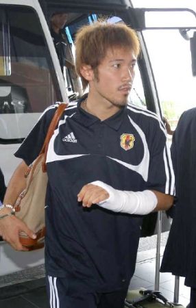 日本代表DF阿部勇樹が25日のサウジアラビア戦で左手甲を負傷。最悪の場合、骨折の可能性も出てきた。ハノイ空港に姿を見せた阿部は、左手をひじ下10センチまで白いギプスで完全固定。「けが? 何も言えません。」と言葉少なだった。サウジ戦の後半8分、右足オーバーヘッド弾を鮮やかに決めた直後、激痛を感じた。着地時に左手を着いた際、手の甲を相手DFに思い切り踏まれたという。「左手? 大丈夫です。」ゴール直後にピッチ上でもん絶した阿部は気丈に90分間プレーしたが、痛みの影響などで全3失点に絡み、試合後のロッカールームではオシム監督から名指しでしっ責されたという。チームスタッフは「やろうと思えば試合には出られるが、ひびが入っている可能性がある。」と語っており、亀裂骨折の恐れが浮上。だが、26日は移動続きで精密検査を受けることができない。パレンバンの病院事情も分からず、最悪の場合は帰国後に検査を受けることになる。・・・阿部のGOALは、気迫と魂を感じるすばらしいものだった。しかし、その代償は、大きなものになったようだ。左手甲の亀裂骨折の疑い。阿部には、3位決定戦を休んで、患部を悪化させないでほしい。サウジ戦の3失点で、1対1の局面に負け一番悔しい思いをしているのは、阿部自身だ。この悔しさを、自分の成長のステップにしてほしい。いや、必ず阿部なら、1対1に負けない自分をつくってくれるものと信じてやまない。・・・