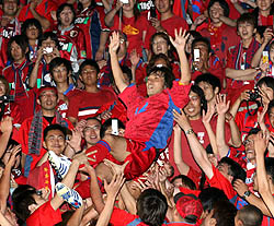 オシム監督は練習前、豪州戦の先発11人を集め約10分間、話した。「もっと良いプレーができたんじゃないか。120分で決められたはずだ。」などと訓話。ドイツW杯での逆転負けの因縁もあった宿敵相手の勝利で、ホッとしかねない状況を戒める“オシム流”だった。DF中沢は「浮かれないで気を引き締める。日本に帰ってから喜びは味わいます。」と改めて気を引き締め直した。・・・さすが、オシム監督。しめるべきところは、きっちりとしめている。昨夜は、オシム監督ではあり得ない「満足」ということばを言っていたが。「満足」したら、前進はない。貪欲に、どんどん成長していってほしい。反省すべき点は、多々あったはずだ。・・・