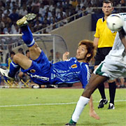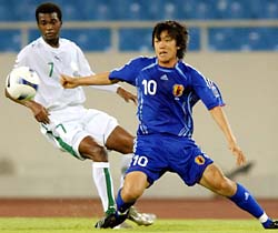 日本VSサウジの準決勝。日本の出足は、よかった。パスもまわり、2列目からの飛び出し、そして、CKやFKを多くゲットした。しかし、シュートが打てない、いや、打たない。ドリブルでの仕掛けがない、ちまちまパスまわしの繰り返し。サウジのプレッシャーは、はやくて厳しい。少しでも、ゆっくり持っていると、すぐに詰められる。焦って、パスを出し、それがうまくつながらない。日本のいいリズムの時に、得点ができなかった。サウジは、FKから、こぼれ球をGOAL。またもや、日本は、先制点を与えた。しかし、その2分後。左CKの遠藤の球を中澤が、GKの前に飛び込んで、GOA~L!!いいぞ、中澤 !!さあ、後半。もっと、積極的にシュートを!!もっと、はやい攻撃を!!がんばれ、がんばれ、日本!!