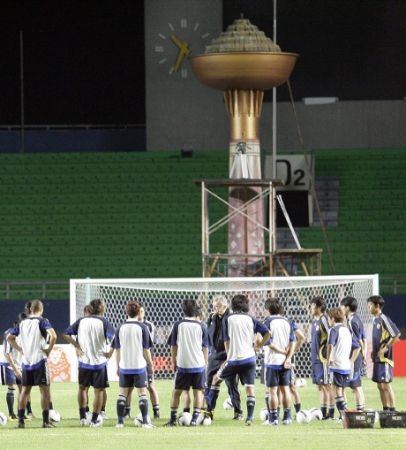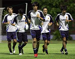 パレンバンの空港から直行し、午後10時20分に試合会場のスリウィジャヤ競技場で練習を開始。左手を痛めていたDF阿部もレントゲン検査の結果、骨に異常はなく打撲と診断されたため、韓国戦への出場が可能になった。23選手は2組に分かれてボール回しからのシュート練習を敢行。長時間移動などのトラブルはあったものの、選手たちは通常通りのメニューをこなした。・・・やれやれ、長時間移動後の夜の前日練習。まっ、耐えるしかないけど。アジアカップ後の反省をAFCには、きっちりしてもらいたい。がんばれ、日本!!・・・