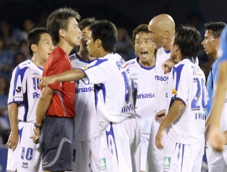 我慢の限界だった。非情のホイッスルでG大阪の怒りは沸点に達した。FWバレーの同点弾に意気上がるはずが、不可解ジャッジに水を差された。終了直後。総じておとなしいイレブンが、猛然と村上主審に食ってかかった。問題のシーンは後半ロスタイムだ。逆転のラストチャンス。ペナルティーエリア内でMF遠藤が背後から倒された。「足が引っかかったのは間違いない。PKだと思う。」と話したが、判定は『ノーファウル』。ゲーム主将のDF山口は「話にならない。線審に聞いたら『僕は見ていない』と言われた。」と首をかしげた。クラブ側も「ビデオで確認してから考えたい。」(佐野社長)と意見書など提出の検討に入った。ピッチにつられてスタンドも暴発。客席から水をかけられた磐田GK川口が挑発し返して、G大阪サポーターがピッチへ飛び降りる騒ぎもあった。さまざまな要因が重なったが、攻撃陣の空転が一番。浦和との差は今季最大の6になったが、西野朗監督は「まだまだギブアップする段階じゃない。」残り8試合。もう足踏みは許されない。・・・残念ながら、この試合は観ていないが。ガンバのここへきてのドローは、痛いドローだ。レッズが不調ながらも、辛うじて勝ち点3をGETしているのに。ガンバは、やっと勝ち点1。レッズとの差は、6まで開いてしまった。残り試合8試合なので、まだまだ、何が起こるかわからないし、どんな展開になるかもわからない。清水や鹿島だって可能性を残している。西野監督が言うように、「まだまだギブアップ段階じゃない!!」そのとおりだ。これからが、正念場だ。がんばれ、ガンバ大阪!!・・・