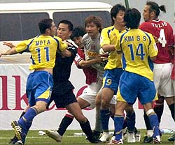 前アジア王者・全北現代を撃破、日本クラブ初の4強入りを果たした浦和イレブンは、晴れやかな表情で成田に降り立った。だが、勝利の余韻に浸っている暇はない。10月3、24日に行われる準決勝の相手は前年Kリーグ覇者で、今季も首位を走る城南一和だ。「ここまで来たら、どこも強い。近いだけいいんじゃないかな。」と中村GM。たしかに準決勝の相手がアル・カラマになった場合、30日の新潟戦(埼玉ス)終了直後の出発となっていただけに、移動の負担軽減は大きい。だが、それ以上に因縁の再戦に気合が入る。6月のA3杯。後半44分のFWモタのPKをGK都築が好セーブ。すると、モタは都築の手におさまったはずのボールに強引に詰め寄った。激しい接触プレーに両チームはヒートアップし、入り乱れての小競り合い。浦和は1-0で勝利したものの、後味の悪さが残った。そんな一戦に向けて、“乱闘”の原因となった都築が「トーナメントは、どうなるかわからない。相手が熱くなってくれれば、ウチのペースになると思う。」といえば、MF長谷部も「冷静にやりたい。」と、平常心で臨むことを強調した。「敵でも多少のリスペクトがないといけない。」とDF闘莉王は、全北現代戦でのラフプレーで切った唇を腫らしながら話した。アジア王者の次は韓国王者。アジア制覇へ、浦和の厳しい戦いは続く。・・・レッズのACL準決勝の相手が、またまた、韓国のクラブチームに決まった。シリアのアル・カマラになっていたら移動だけでも大変だった。お隣り韓国で、やれやれだ。しかし、どうも韓国のクラブチームは、はちゃめちゃが問題。熱くなるのはいいことだが、ラフプレーや小競り合いがねえ。A3杯でも、いろいろトラブルのあった城南一和戦、どうなることやらだ。一番の心配は、「怪我」だ。レッズ選手が、冷静なことは救いだけど。スポーツなんだがら、フェアプレー精神で戦ってほしい!!・・・