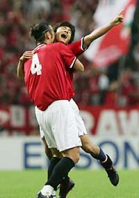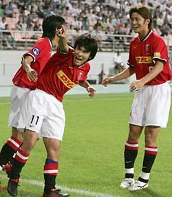 きっちり取るべき選手が取り、守るべき選手が守った完勝だった。代表やJリーグ勢が何度も苦汁をなめてきたアウエーの韓国で、浦和が前回王者の全北を下し、準決勝進出。アジアの頂点にまた一歩近づいた。第1戦は勝ったとはいえ終了間際に失点し、リードは1点。観客席で発煙筒がたかれ、花火が飛ぶ緊迫感の中でも、アジアの戦いを積み重ねてきた浦和の選手はたくましかった。勝負を決めたのは田中達の電光石火の一発。前半4分。ポンテのミドルシュートをGKがこぼしたところに、鋭いダッシュで詰めて右足で押し込んだ。開始早々に2試合合計は3-1。焦りから不用意な反則を繰り返し退場者を出した全北に対し、後半22分にはポンテの左CKがオウンゴールを誘発。手負いの相手の反撃は、闘莉王、坪井、阿部の日本代表で固める3バックが最後まで冷静に封じ込めた。歓喜にひたる暇はない。10月3日には早くもアウエーで準決勝第1戦が待ち受ける。アジアの最高峰を極める戦いは胸突き八丁を迎える。・・・レッズが、アウェーの地で、準々決勝2試合目を戦い、2-0で、全北現代をやぶり、準決勝進出を決めた。おめでとう、レッズ!!1点目は、ポンテの強烈なシュートをGKがはじき、きっちりつめていた田中達也の「ごちそうさま」GOAL!!レッズサポへ、いつものリングKISSをする田中達也の顔が、なんだか誇らしげだった。2点目は、左CKをポンテが蹴り、相手DFにドンピシャリと当たりオウンゴール!!これで、試合は決まった。そして、そして、僕の待ち望んでいた小野伸二は、後半30分に、いつものようにポンテと交代してピッチへ。33分に、平川のグランダークロスをダイレクトで、永井へ。あ~、とても芸術的なパスだった。うまくパスがつながらず、失敗に終わったが、小野の唯一の見せ場だった。それにしても、レッズサポは、すごい!!3000人以上が、日本から乗り込み、完璧にホーム化していた。レッズサポの声だけが、スタジアムに響き続けていた。レッズサポの応援は、選手たちに心強かったと思った。ゴール裏だげのシーンをTVで見たら、誰が見ても、アウェーには見えなかった。レッズの選手&スタッフ&サポのみなさん、本当にご苦労様。・・・