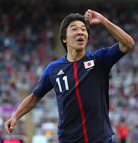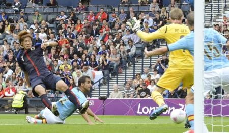 英国の乾いた空気を切り裂いた。関塚ジャパンに自信と勢いをつける、鮮やかな一撃だ。1―1で迎えた土壇場の後半42分、大津が相手のクリアボールに反応する。次の瞬間、右足一閃(せん)。豪快なボレーシュートが20メートル先に向かった。相手GKの伸ばした右腕をかすめ、サイドネットに突き刺さった。「あざーっす。いやーもう、自分で想像してた通りの軌道に行って、いいゴールになったんで良かったっす。」“チャラ男”を自任するストライカーの口ぶりは劇的ゴールで一層、滑らかになった。五輪仕様の真っ赤な戦闘服に身を包み、会心の笑みが止まらない。・・・メキシコは、強いだろうなあ、と、思いながら観戦したが、本当に強かった。メキシコの選手が、3~5人多いのではないかと感じたほど。パスも、動きも、すばらしかった。圧倒的なボールポゼッションのメキシコに、日本は、耐えるしかない試合だった。(たぶん、スペイン戦も、同等以上かな。)さて、そんな強いメキシコから、奇跡的な開始1分の先制GOALには、びっくり。これは、粘りのある芝にボールスピードが奪われ、清武がうまくパスカット。永井がスピードを生かしサイド突破し、グランダークロスに、東がドンピシャ合わせ。見事な先制点だった。が、日本のよかったのは、ここまで。後は、延々にメキシコペース。日本は、よく守備で耐えたというべきか、相手ミスにも助けられ、1点で抑えたというべきか。前半1分から、後半42分の大津のスーパーボレーシュートまで、清武のループ外しと枠外ボレーシュートのみ・・・とほほ。前半は、押されっぱなしだったが、後半は、少々押し返しも、メキシコの強さには太刀打ちできず、そして、粘り芝にたびたび苦しめられた。関塚監督の先発、そして選手交代は、山村以外は、よかったかな、と。(山村は、DFとして機能していない。寄せない、当たらない・・・見ている。)宇佐美がまったく存在感なしで、齋藤へ。齋藤は存在感をみせた。永井は、スピード生かし奮闘し、大津へ。吉田のフィードを、杉本がせり、落ちたところをダイレクトボレーの決勝点。すばらしい大津のGOALだった。85分を1失点で耐えに耐えた日本の勝利。どん底U-23が、少し光明をもって、いよいよ、スペイン戦へ。がんばれ、U-23日本代表!!・・・