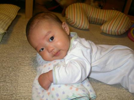 下半身は左右にブンブン振って今にも寝返りをしそうなのに、うでが弱かったら顔を持ち上げられないからマズイよね?