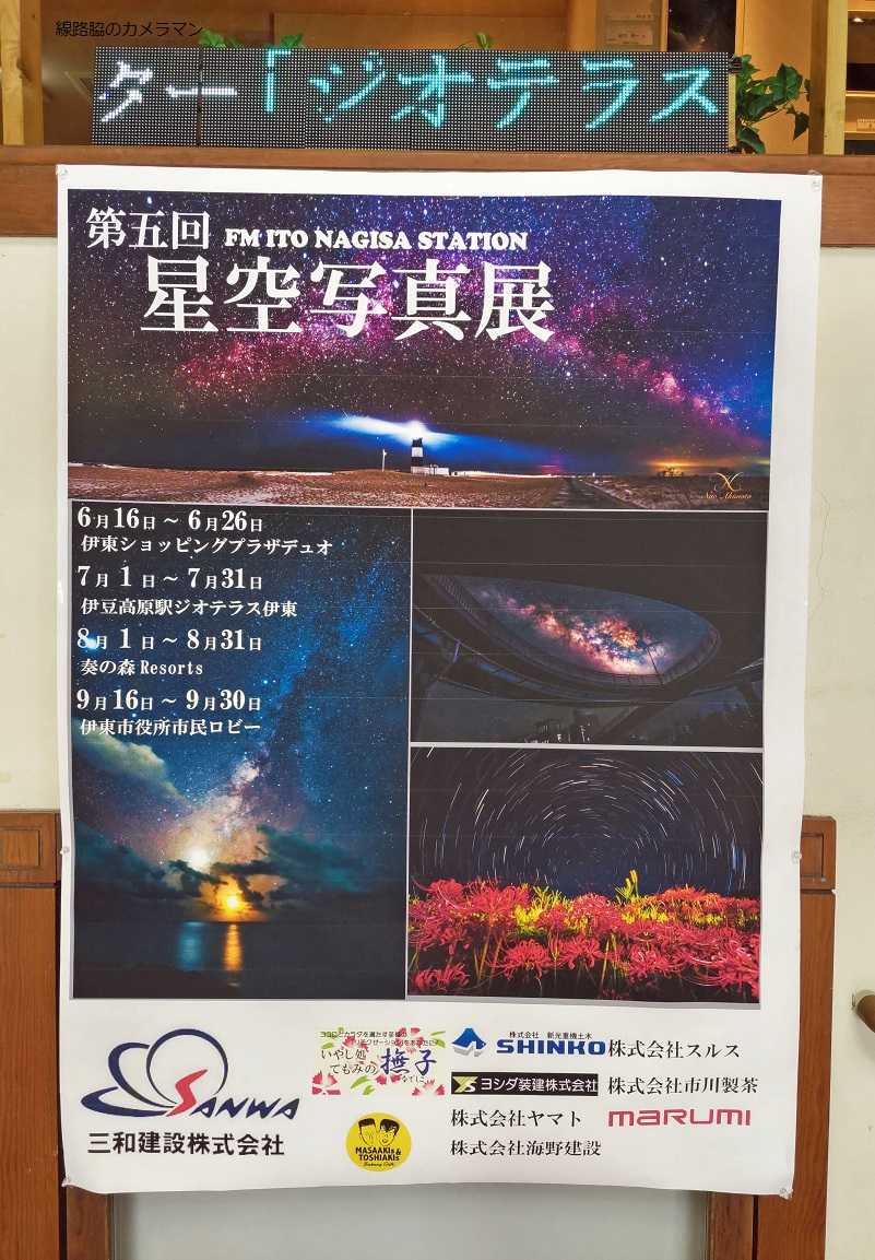 ●星空写真展毎年伊東市のFM局が主催する第5回「星空フォトコンテスト」の入賞者写真展が伊豆高原駅ジオパーク内で展示されている。今回の応募は全国から241点で、力作の中から各賞が選ばれ展示されている。星空なので暗い写真となっているため室内の照明など映り込みがある。こちらが上位3点。
