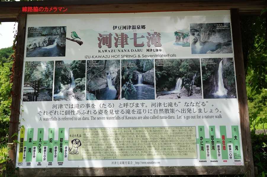 ●涼を求めて七滝散歩ランチも済んだので涼しいであろう滝を目指して歩き始める。木々が生い茂る小道を歩くので、直射日光を浴びることはないためか確かに涼しい。下の河原を見ると、洞窟風呂の前の川にイスを出してある。温泉も良いが冷い川の水も最高だろう。数日前の雨のためか水量は多いようで、なおさら涼しく感じる。夏になって恒例の風鈴も飾ってある。踊子の像がある初景滝から階段を上り、蛇滝、えび滝と登ってゆくと川の中にキャニオリングをしている3人組を発見。1人はガイドであろう。最後は釜滝だが、滝の高さが高いので凄い水しぶきが舞っている。これは自然のミストで最高だがカメラも濡れそうだ。 帰りに、先ほどのキャニオリングの人たちと再び巡り合った。滝壺へダイブ。主催は、水上や尾瀬、伊豆でキャニオリングやラフティング、サップなどが体験できる「フィールドアース」で、レンタル装備込みで8,000円のようだ。大小の滝を使って、上を向いてや頭から落ちるなど様々なスタイルが体験でき、最後は落差10mの初景滝をダイブするのだ。ガイドは1回転のダイブを披露した。帰りがけには6種類もあるカップアイスの中から選んで食べて休憩となった。