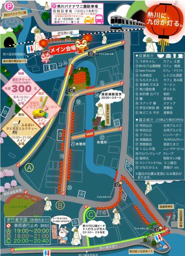 ●熱川の台湾提灯 稲取からの帰りがけに熱川温泉に寄ってみた。 伊豆急伊豆熱川駅から直ぐ目の前の公園では「熱川に九扮が灯る」と題したイベントの一環で、台湾の九扮をイメージした台湾提灯が点灯している。温泉街に1200個の提灯が18時から23時まで点灯している。東伊豆では最大の温泉場として栄えた熱川温泉であるが、最近では衰退した街並みとなり以前の賑わいを取り戻そうと旅館組合などが協力し昨年から始めた。先月は伊豆急のリゾート21の団体列車も運転され、熱川に下車して盛大にイベントが行われた。台湾九扮のお茶屋。
