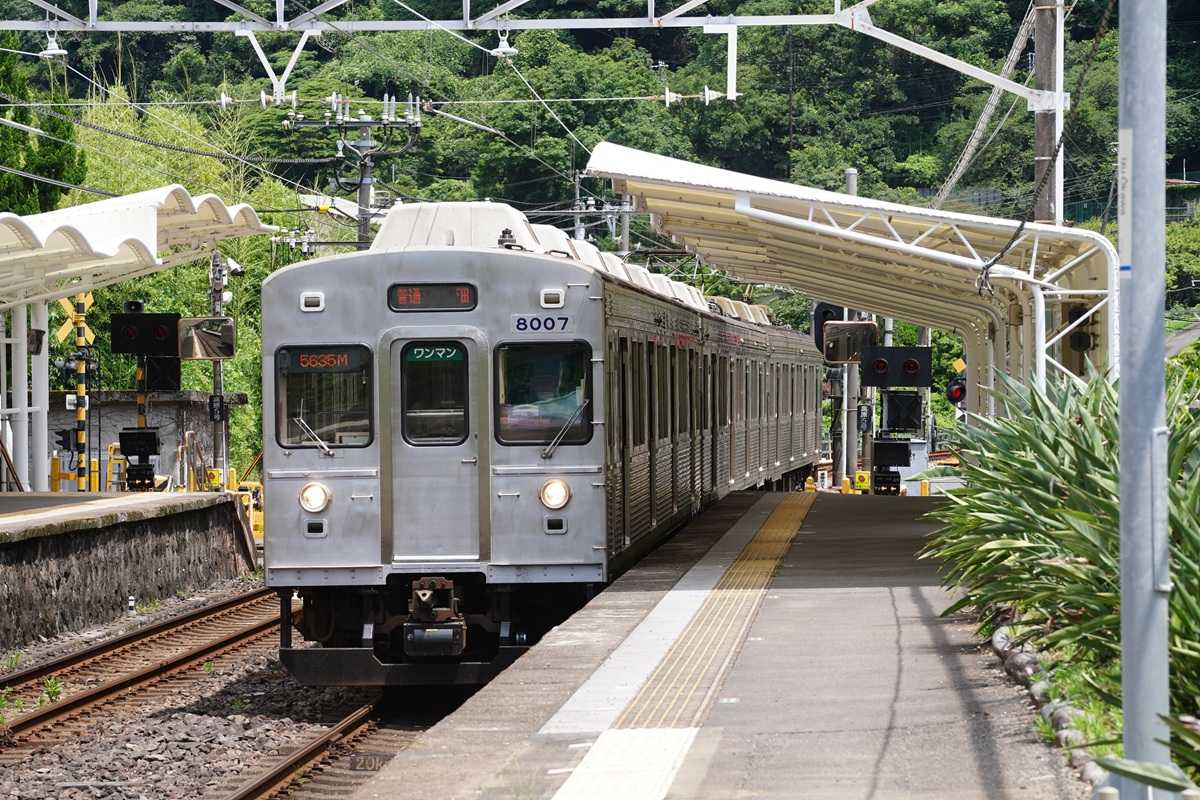 ●久しぶりの電車乗車下田に用事があり久しぶりに電車で出かけた。乗車したのは8000系の無ラッピング通称スッピン車のTB-73両編成だった。当然先頭車のカブリ付きの場所に陣取る。伊豆大川駅で下田からの特急踊り子2号の通過を待つ。3両編成の列車はワンマン運転なので運転士が車内放送やドアの開閉を行う。ホームからの眺めがよい伊豆北川駅と湯煙たなびく伊豆熱川駅と各駅に停車する。最近の片瀬白田駅ではなぜか外国人の乗り降りが多い。特にリゾート21は体験乗車のバスツアーが多い。眺望自慢の東伊豆海岸線なのだが、暑さのためか海上に水蒸気が発生しているようでスッキリしない。河津駅に侵入するこの景色は好きな場所だ。終点の伊豆急下田駅に到着すると、車両内の清掃とトイレ洗面所用の給水、先頭車ガラスの水洗いが行われる。この車両は鉄道ファンに人気があり貸し切り運転もできる。