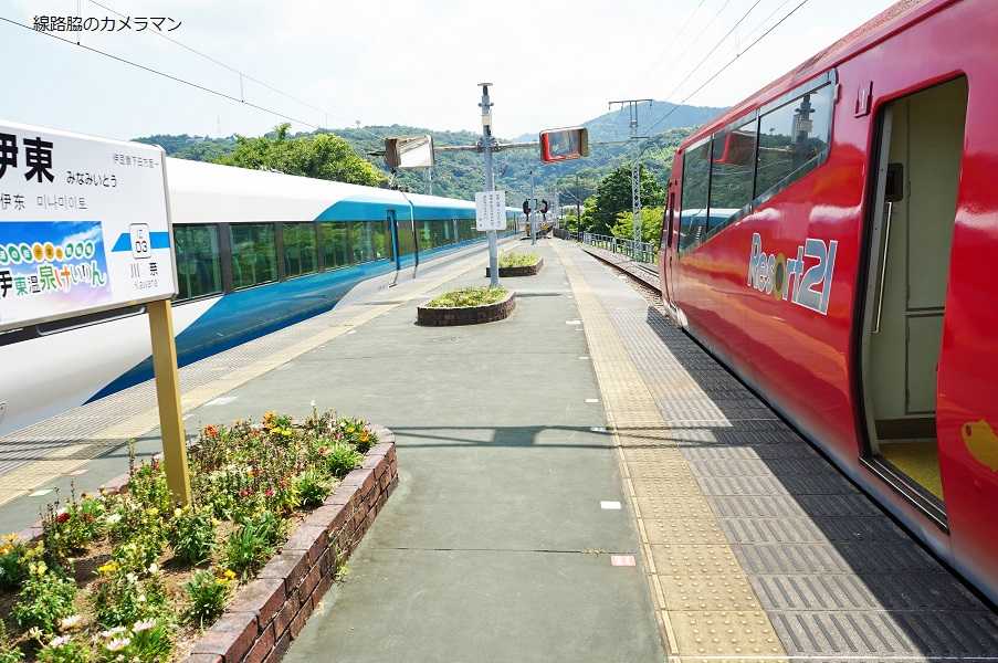 ●3000系顔合わせ伊豆急の3000系は4両編成が2本ある。今回は滅多に遭遇しないシーンを撮りに出かけた。場所は南伊東駅のホームで、ここで3000系の上下列車が並ぶシーンが見られるのだ。先行列車は2100系キンメ電車と257系踊り子号の交換シーン。この南伊東駅はネーミングライズとして「伊東温泉競輪場」が副駅名となっている。駅から500mほどのところに競輪場がある。ホームの中間に駅出入口への階段があり、信号所が併設されている。次に上下から3000系電車が入線してくる。本来は上り列車は2100系リゾート21なのだが、先月初めに4次車である「黒船電車」が車両不具合とのことでピット入りしている為、代走として8000系や3000系が運用されているからだ。しかも、運転日や交換駅が限定されていることで珍しいシーンとなった。
