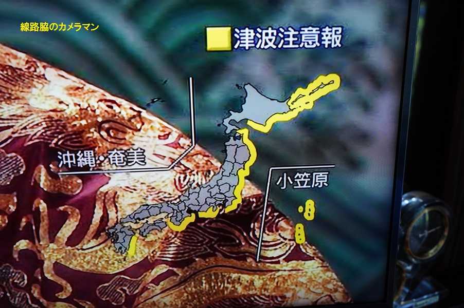 ●津波注意報夏休みで海水浴場も混み始めた時期の朝方8:30頃に突然町内のサイレンが鳴り響いた。近くで火事かと思ったら市の広報LINEで津波情報が伝達された。日本の太平洋側一体に11時頃に1m程度の津波が来るとの事。調べてみると北海道の北東にあるロシアのカムチャッツカ半島付近で8:25に地震が発生したらしい。9:40に再び津波注意報が鳴り響きその後、M8.7として津波警報に変更され津波は3mという規模のようだ。これにより沿岸を走るJR、私鉄の鉄道・バスが運休となり、道路も通行止めとなったところもある。伊豆でも東海道本線、伊東線、伊豆急行線、伊豆東海バスが運転見合わせとなった。海抜の低い地域には避難指示が発令され、伊豆急下田駅では高台の中学校に、伊豆高原駅では3番線に8000系6両を留め置きクーラー付きの待合所とした。沿道の各バス停には情報が呑み込めないのか外国人が長時間待っている光景も見える。上空には、事故なのか熱中症なのかドクターヘリが飛んできた。熱川に用事で出かけたが、熱川の海水浴場は遊泳禁止となり人っ子一人居ない。ライフセイバーも居ない。津波には関係なく、今日は台風接近の影響で海が荒れているので津波のように見える。写真はちょうど第1波の津波到達時刻だった。海辺に一番近い片瀬白田駅に行ってみると、待合室に二人の中国からの観光客が電車を待っていた。どこまで行くのと聞くと、東京までだという。翻訳アプリで津波が来るとの説明をし、ここは海に近く危険だからと伝えると「何処が安全ですか?」と聞かれたので、帰りがけなので伊豆高原駅まで乗せて行くことにした。日本語の他にも英語と中国語が表示されている。運休しているのは分かるが、いつまでなのか誰も分からない。伊豆高原駅では、駅員がスマホアプリを使い外国人に案内をしている。彼女達とゆっくり話をする間もなかったが、無事に帰れたか心配だ。海岸に最も近く危険で無人駅の片瀬白田駅より、ここなら食事とれるし詳しい情報も聞くことができる。先日デビューしたクルーズ船「飛鳥Ⅲ」は北海道から横浜に帰港中で三陸沖を航行中だ。今回の場所では20日からM7の地震が発生している。過去には1952年11月4日、この場所でM9の巨大地震が発生し現地では15~18mの津波が、日本にも3mの津波が押し寄せてきている。結局、18:30に津波注意報に変更となり東海バスは運転再開、伊東線と伊豆急行線は20時過ぎに運転再開となった。夜遅くまで何度も津波が来たのは、ハワイ諸島から北西に延びている「天皇海山群」と言う太平洋海底の岩礁山脈に津波が跳ね返って来る現象のようだ。ロシアの震源地付近では4m〜6mほどの津波があったが、日本への津波は沖縄で10cm〜東北の最高1.5mで被害は少なかったようだ。日本以外のハワイのマウイ島でも1.7mの津波が観測され被害が出ている。津波経験のあるトンガでも避難対策をしている。