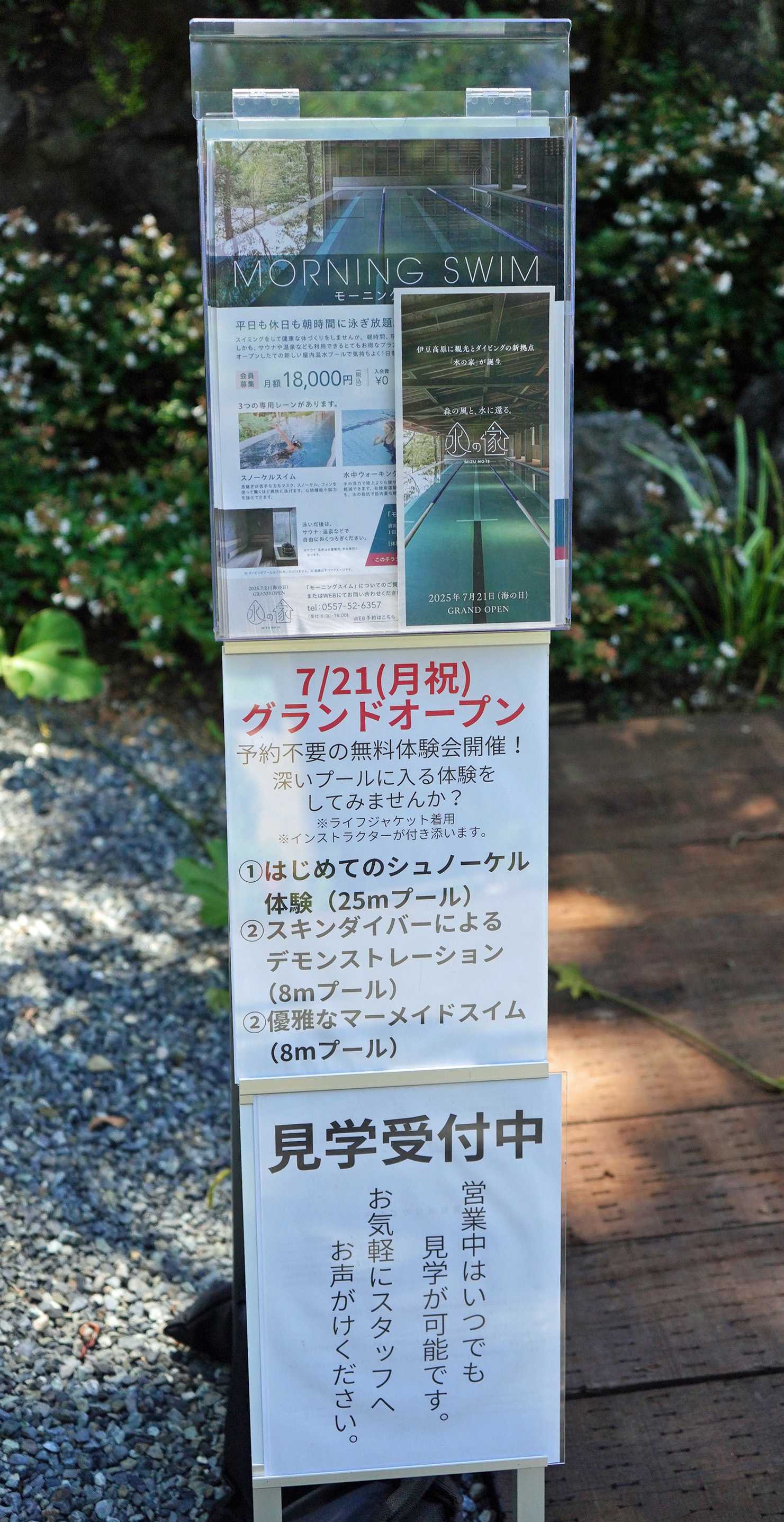 ●水の家オープンこんな山の上に「水の家」とは何だろう。伊豆高原の別荘地の中に、ダイビングプールとスイミングプールが新設された「水の家」が海の日にオープンした。場所は、大室山の麓の南大室台別荘地で、コンクリート打ちっ放しの建物が完成した。今日は完成披露なので希望者はプールでシュノーケリング体験ができる。体育館ほどの広さの内部には、6m×25mのスイミングプールと、水深8mのダイビングプールがあり、シュノーケリングの練習や水中ウォーキングが楽しめる。1階ロビーには、ダイビングプールで訓練している様子をガラス窓から除くことができる。今日はお披露目日なので、ドルフィンスイムをする人魚のような女性スイマーが潜っている。松元さんは素潜りの日本のメダリストで無呼吸で70m以上、6分以上も息を止めることができる。二階に上がると、25mプールと深さ8mの潜水プールがある。人魚もひと休み。ジャグジーもある。利用料金は、10:00~18:00まで利用できる1day PASSが4,000円~8,000円(施設・プール・Eバイク利用)などのコースがある。一般の方も利用できるが、城ケ崎や富戸、八幡野などにあるダイビングショップから訓練をする場所にも使用するようだ。また、朝8:00~10:00まではモーニングスイムがあり月額18,000円。1回利用は3,000円。階下には、一年中利用できる温泉を利用したジャグジーと、かけ流し温泉、フィンランド式サウナもある。この温泉は水着利用となる。こちらはサウナルーム。水風呂。直ぐ隣には宿泊施設も併設されている。