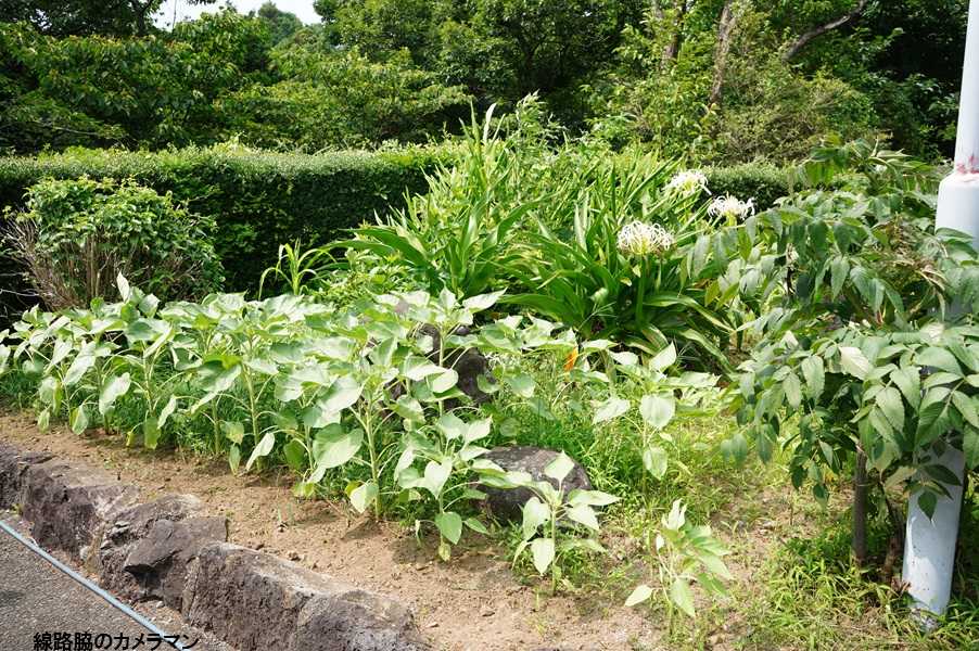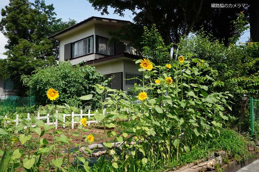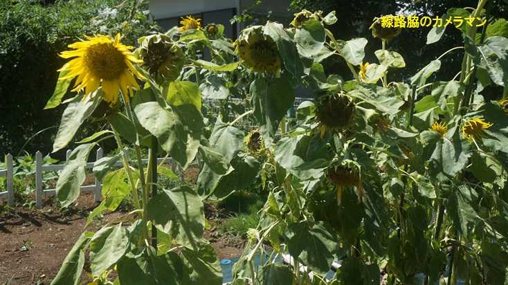 ●ひまわり撤収最近の天候不順のためか、「STUDIO72」の「ひまわり」も咲き終わりショボくなってきた。本来リスの餌として買ってきたヒマワリの種が2mもの大きさになるとは驚いた。もうすぐ台風のシーズンを迎えるので、道路側に倒れると危険なので撤去することにした。畑の周囲の草も直ぐに伸びるので今年3回目の草刈りをする。この刈った草も無駄にはしない。近所のヤギの餌にもなるし、乾燥させて野菜の根元に敷いてあげれば高温時の乾燥対策となるのだ。また、料理の時使う玉子の殻も捨てないで、粉上に粉砕して野菜の根元に肥料として撒いてみる。頂点に咲くのが雄花で、開花すると花粉が飛び散り下にある雌花で受粉する。下にあるのが雌花で受粉すると実が大きくなる。試行錯誤した結果なのか、今年の作物は順調だ。全て3株程度なのだが、キュウリは100本ほど、トマトはすでに300個、その他ピーマンやナスも順調だ。上は先日分、下は今日の分2日もすると完熟する。トウガラシも赤くなってきた。空心菜。部屋で休憩しながら畑を見ていると、大柄の磯ヒヨドリがトマトを狙ってついばんでいる。暫くするとリスがやってきて赤いトマトを1個持ち帰った。これで畑の下に落ちているトマトの犯人が確認できたが、少しの量なので見逃してやろう。枝豆の第2、第3弾と時差で植えてある。