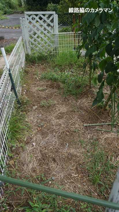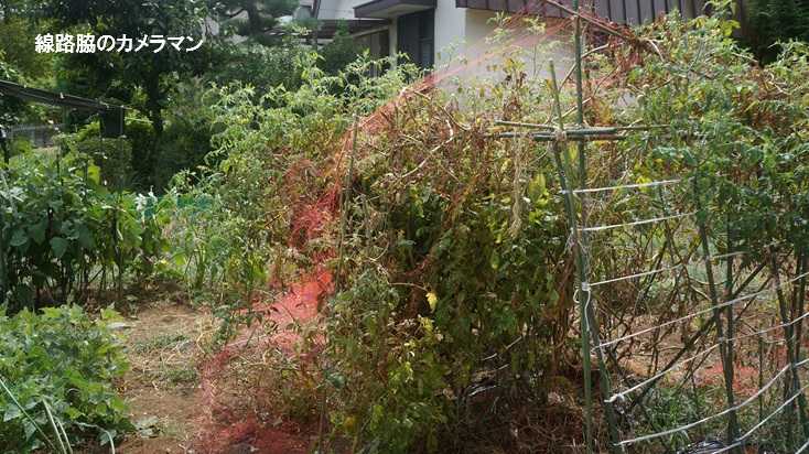 ●トマト撤去ついにトマトの収穫数が減ってきた。連日の暑さもあるし寿命なのか実が少なくなってきたので撤去することにした。今年は、中玉1株とミニトマト2株の3株だったが、結果的に目標以上の1500個も収穫できた。完熟して落ちた物、日当たりや鳥などにより捨てた物は200個ほどあるので、900個の目標を十分にクリアしているので満足である。撤去したらすっきりした。ついでに、まだ元気に実をつけているナスが日焼けしないように日除けを付けてあげよう。トマト畑撤去で出たポールを利用して枠を組み、正式な日除けシートがあるのだが大きすぎるので黒い防草シートを張ってみた。今日は台風接近で久しぶりの雨が降るので水撒きはやらなくてよい。今日の収穫、トマトは最後でした。隣の里いもも暑さで葉が枯れてきた部分もあるので日除け対策をしたい。