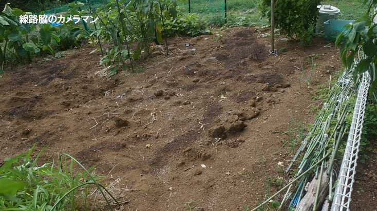 ●畑整地夏野菜でたくさんの実りを与えてくれた畑だが、次の植え付けまでの間少し休ませよう。今年はキュウリ、トマト、枝豆、ピーマン、空心菜、ナス、大葉、ニラなどが期待以上の収穫となった。草を根ごと取り、固くなった土をスコップやクワで掘り返す。これにより土中に空気が含まれ水や栄養分が浸透しやすくなる。今日も30℃以上の天気で、大室山が隠れるほどの霧が発生し非常に湿度が高く蒸し暑い。1時間も作業をしていると汗でTシャツもパンツも搾れるほどになる。後日、苦土石灰や肥料などを加えて次の準備としよう。 熱中症にならない程度に切り上げて、冷たい水シャワーを浴びると生き返ったようだ。長ナスと里芋はまだまだ成長中なので楽しみだ。しかしこの猛暑の中、本格的に畑や田んぼをやっている人たちのことを考えると猫の額のような畑で悲鳴を上げているのが恥ずかしくなる。近くの友人が初めて田んぼを借りて稲作に挑戦したが、収穫前に残念ながらシカに食べられてしまったようだ。