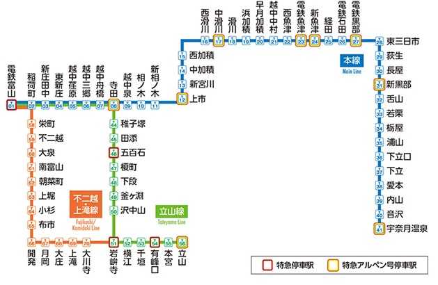 ●富山地鉄廃線?ネットのニュースを見て驚いた。北陸の私鉄「富山地方鉄道」が一部区間廃止を計画しているとのこと。富山地鉄は、富山から立山や宇奈月温泉まで3路線で総延長100kmもの路線を抱えている。まず、立山線の岩峅寺〜立山間が廃止と不二越・上滝線の月岡〜岩峅寺間は上下分離方式にする計画。 また、富山から本線である宇奈月温泉までの途中区間では、滑川〜新魚津までは「あいの風とやま鉄道」と並行区間となっているので経営が厳しいようだ。最近のインバウンドの需要もありそうだったが、8億円の赤字となり地方自治体の支援が無ければ存続不可能となった模様。来年の11月をめどに廃止を計画しているのは、この並行区間の滑川〜新魚津間を含む宇奈月温泉までで、沿線自治体からの支援意思が無ければ廃止届を提出するとのこと。宇奈月温泉駅。黒部トロッコ列車への乗り継ぎ駅となっている。立山駅もケーブルカーへの乗り継ぎ駅となっている。今でも一大観光地となっている。今後は早急に協議をすることになるが、いずれの路線も、日本有数の観光地である立山アルペンルートや黒部峡谷鉄道への玄関口へのアクセスとなっているので、それが分断されてしまうことになる。富山駅。富山地鉄は鉄道の他に、市内電車、路線バス、高速バスも運営している。鉄道車両では、首都圏で活躍していた元西武鉄道や東急電鉄、元京阪電鉄など多彩な顔ぶれとなっている。なお、いち早く路線バス部門では運転手不足などの理由から多くの路線が廃止されている。