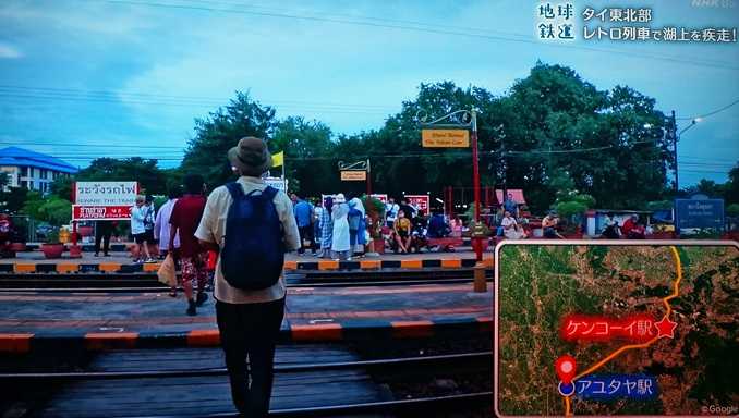 ●地球鉄道(ダム湖を走る)偶然に見つけたテレビ番組で「地球鉄道」がある。NHKBS放送で、東南アジアのシンガポールからタイ〜中国〜中央アジアを経てヨーロッパのジブラルタル海峡までの25,000㎞と長ーい鉄道旅を俳優の中山卓也が案内する旅番組なのだ。その7回目の模様を紹介したい。アユタヤ遺跡を後に、チェンマイ方面と別れラオス国境方面に進む。アユタヤ駅の北側には、タイの王様が訪れた時に使用する王宮ホームがある。ケンコーイまでは50㎞1時間の旅。18:50発の301列車はGEA型4500形(アメリカ製)がけん引する客車6両編成。車内は木製のボックスシートだ。列車は北線のロッブリー行だから分岐点のケンコーイで乗り換える。翌日の列車は、ノンカーイ方面行き5:30発の433列車。RH1000型で日本製のディーゼルカー2両編成。ここでも途中から乗ってきた売り子さんから大きなガイヤーン(焼き鶏)を買って朝食とする。この路線の目玉はパーサック・チョンラシト・ダムのために作られた人造湖の上を走る。バンコクに住んでいた時に、季節の観光列車「ひまわり列車」に乗るため指定席を確保しようと何度も窓口に通ったが満席だった。この観光列車の特典として、雨季後に水が満たされた湖面の上の鉄橋上に、25分ほどいったん停車して一時降りることができるのだ。その後、ヒマワリ畑の見学となる。これは趣向品の「檳榔(ビンロウ)」で覚醒作用がある。車内でタイ米を作っていることを聞いて9:16着のバーンルアム駅で途中下車する。駅前の田んぼでタイ米の田植え体験をしてごちそうになる。冬がないタイではコメは年に2回3回採れるのだ。