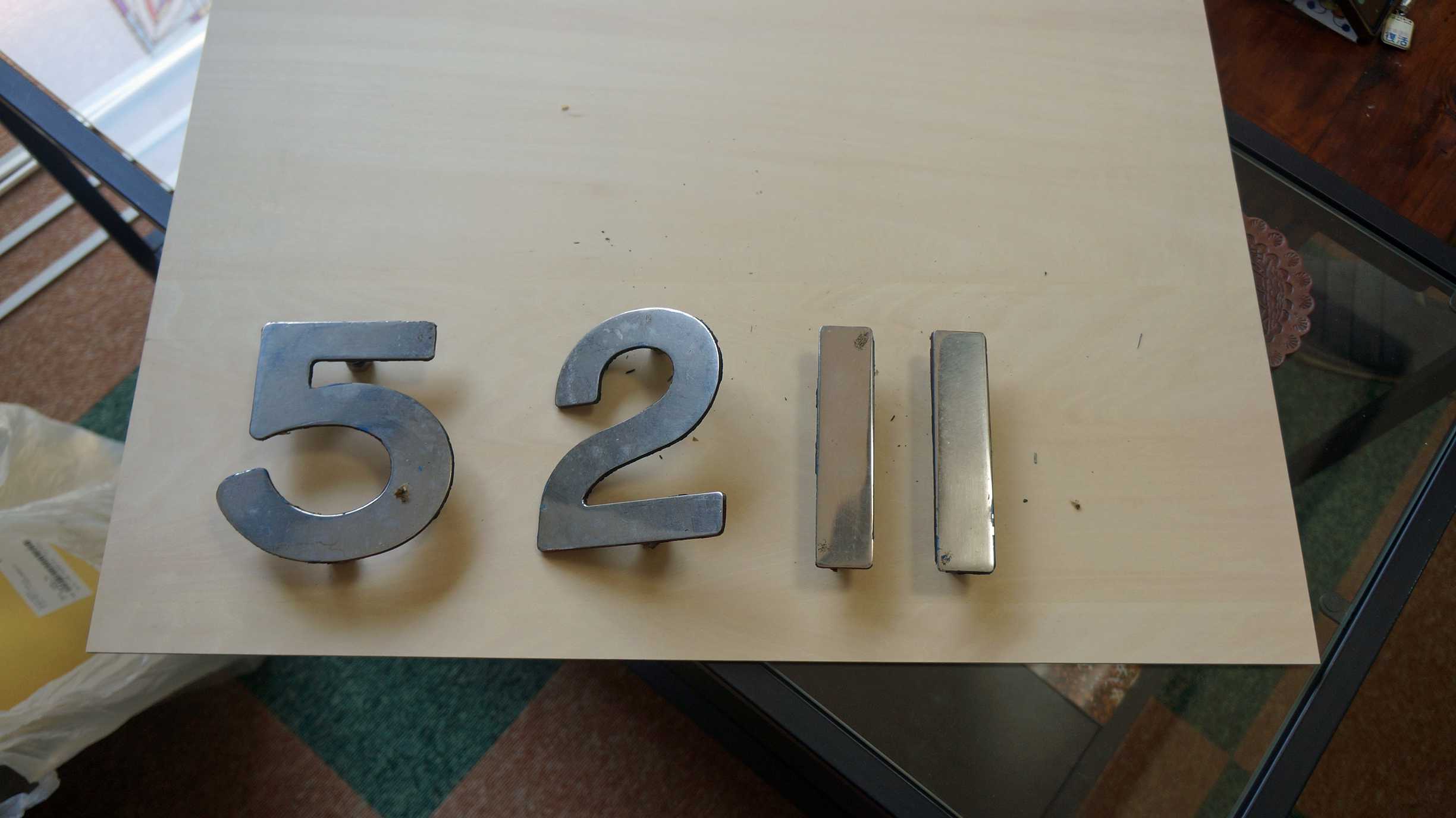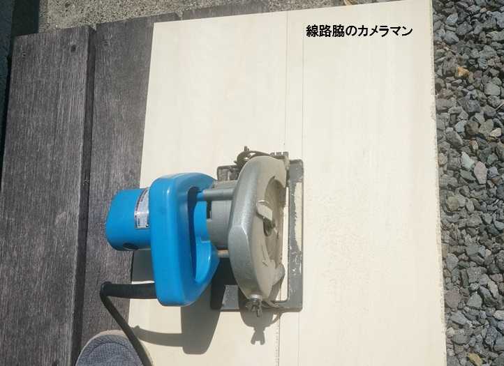 土台になる板を電ノコで半分に切って、金属文字を取り付ける。