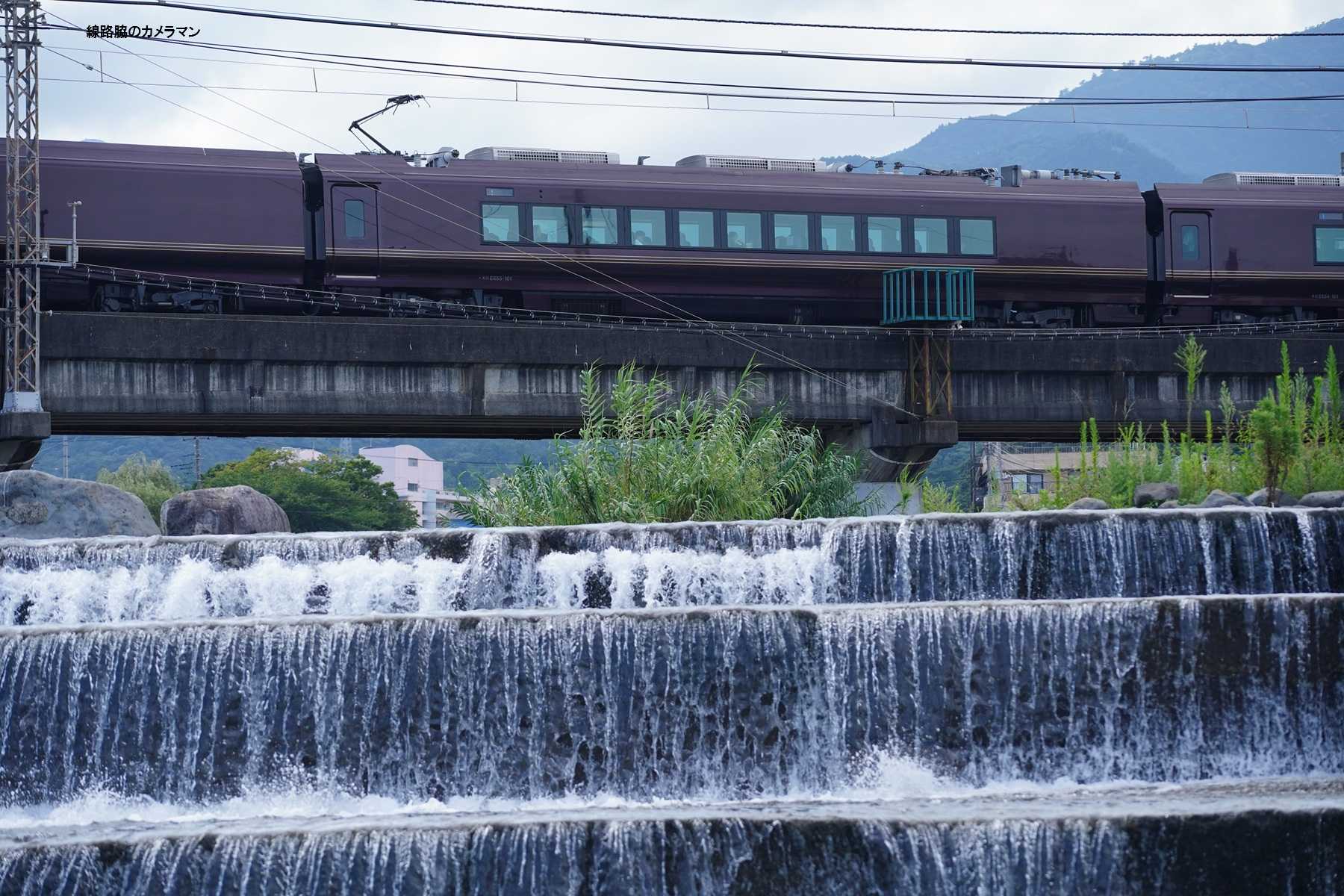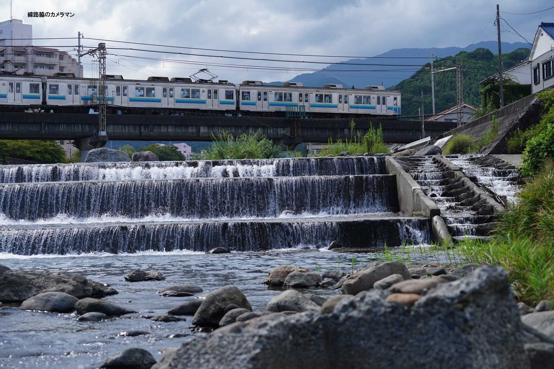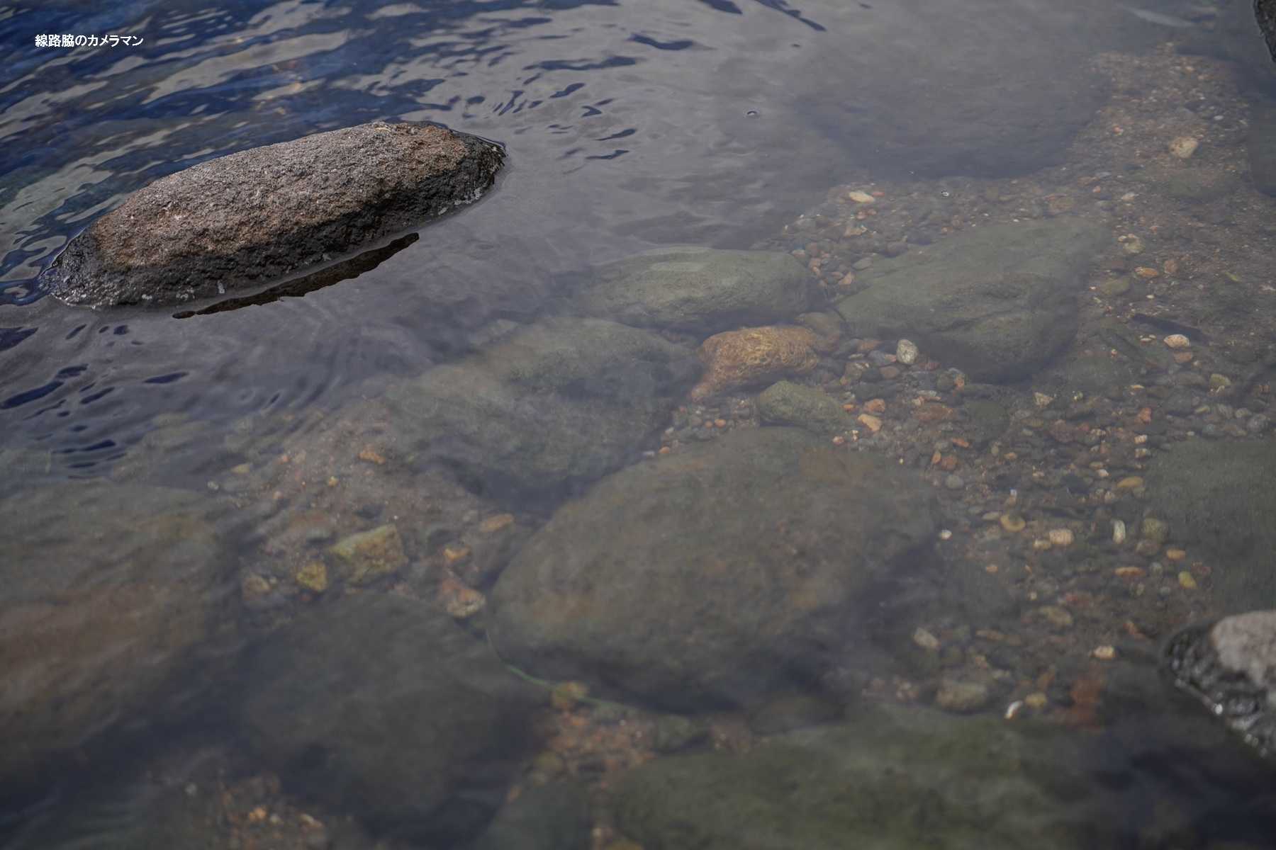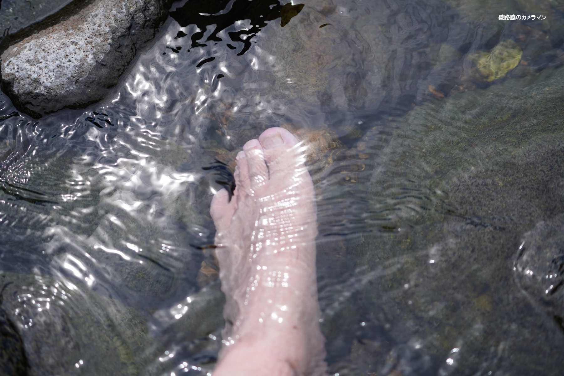 時間があるので、素足になり石に腰かけて川に足を付けて先行列車を撮影してみた。