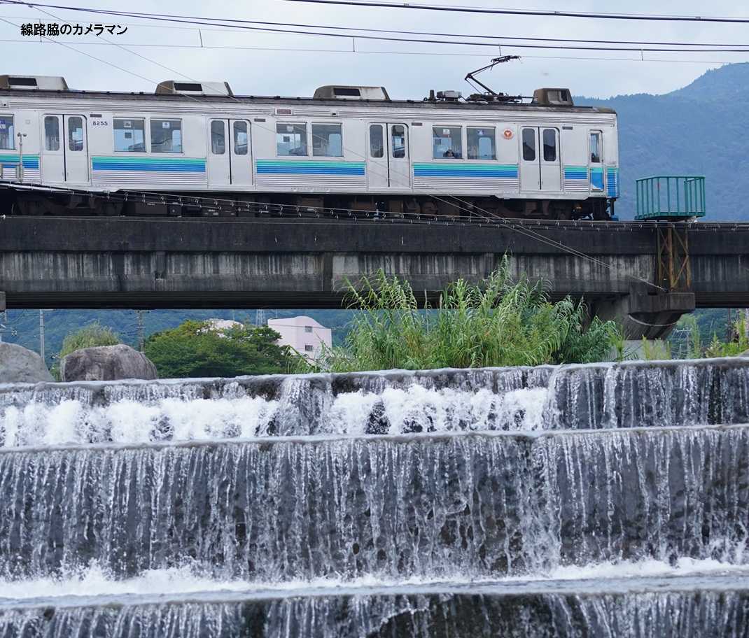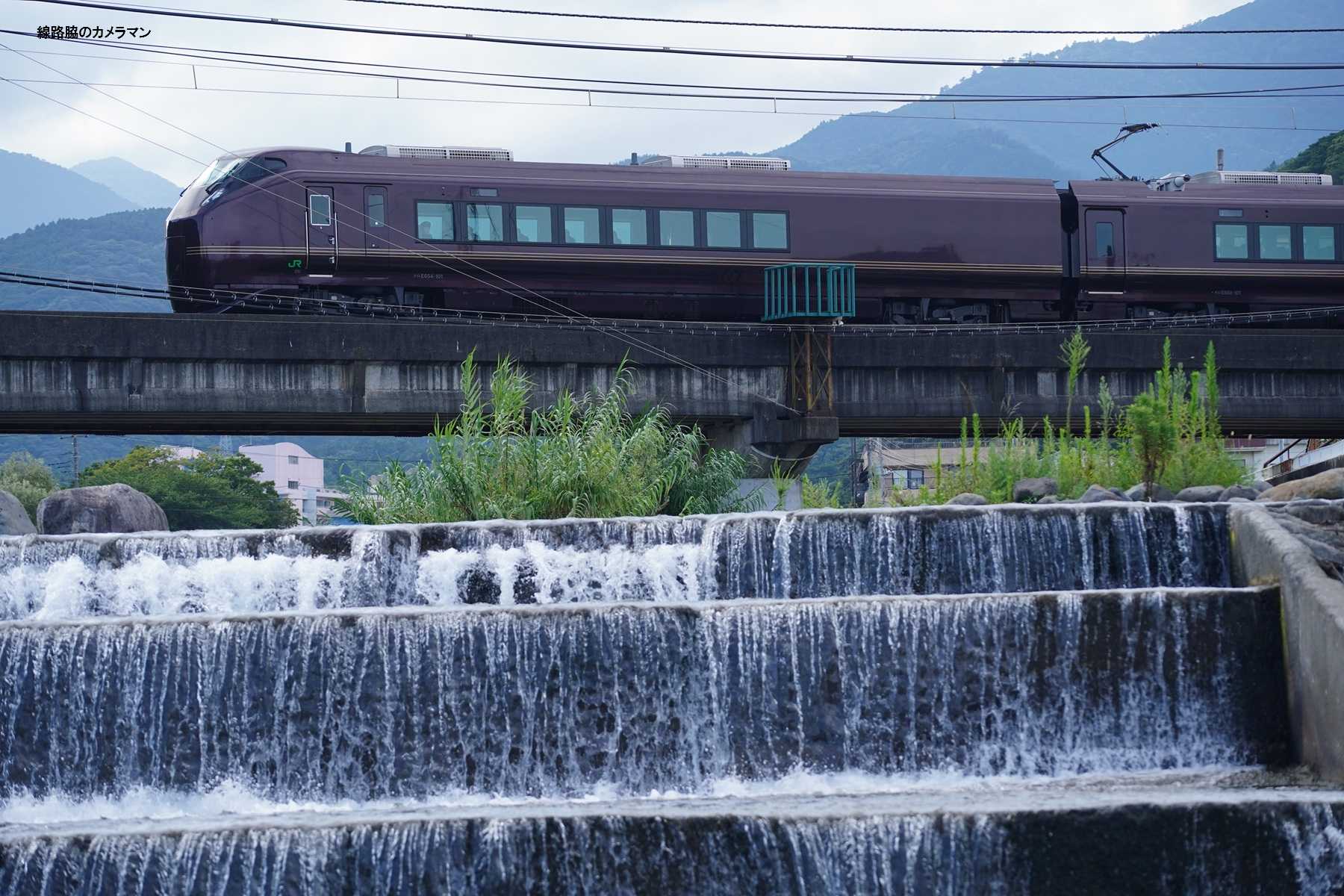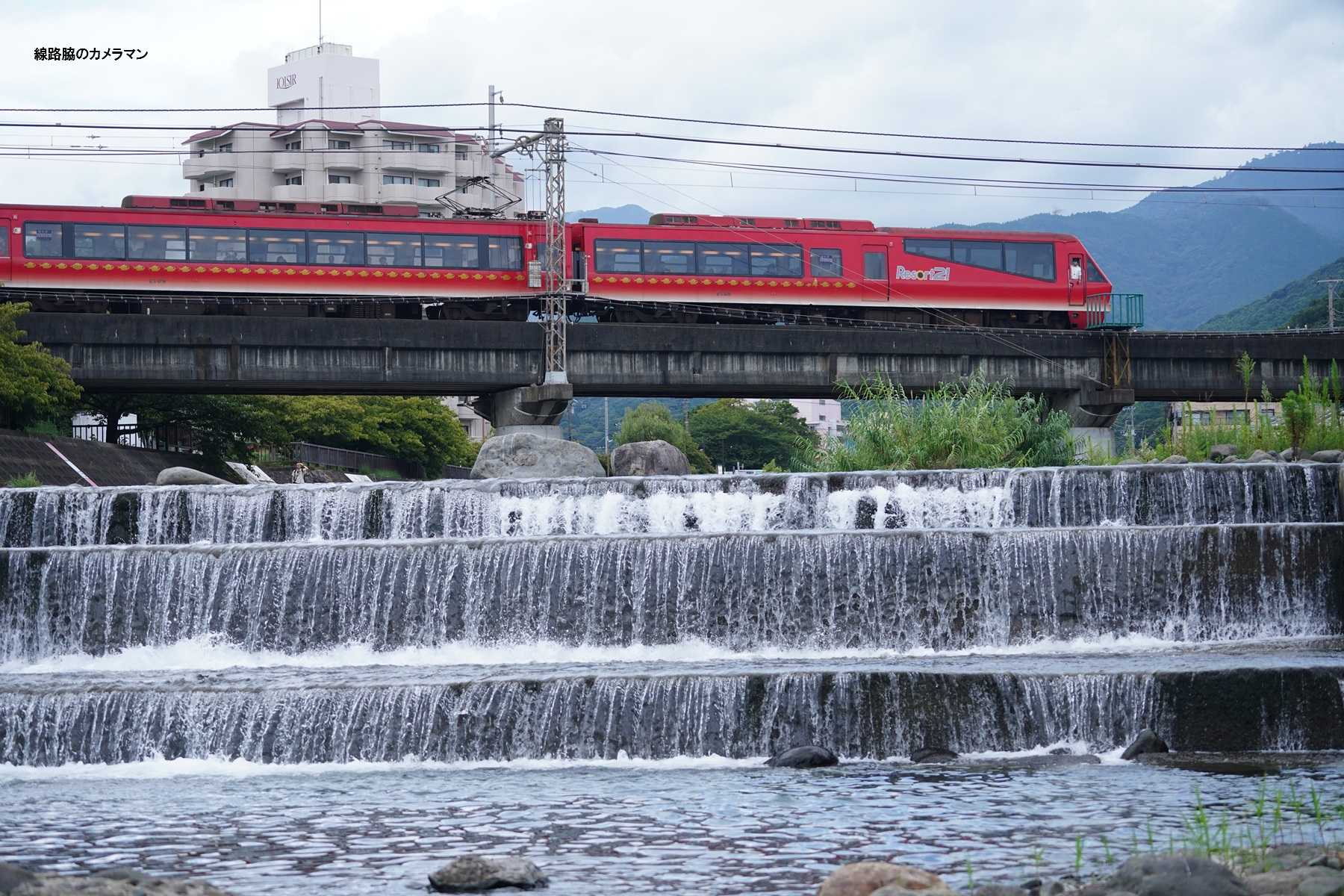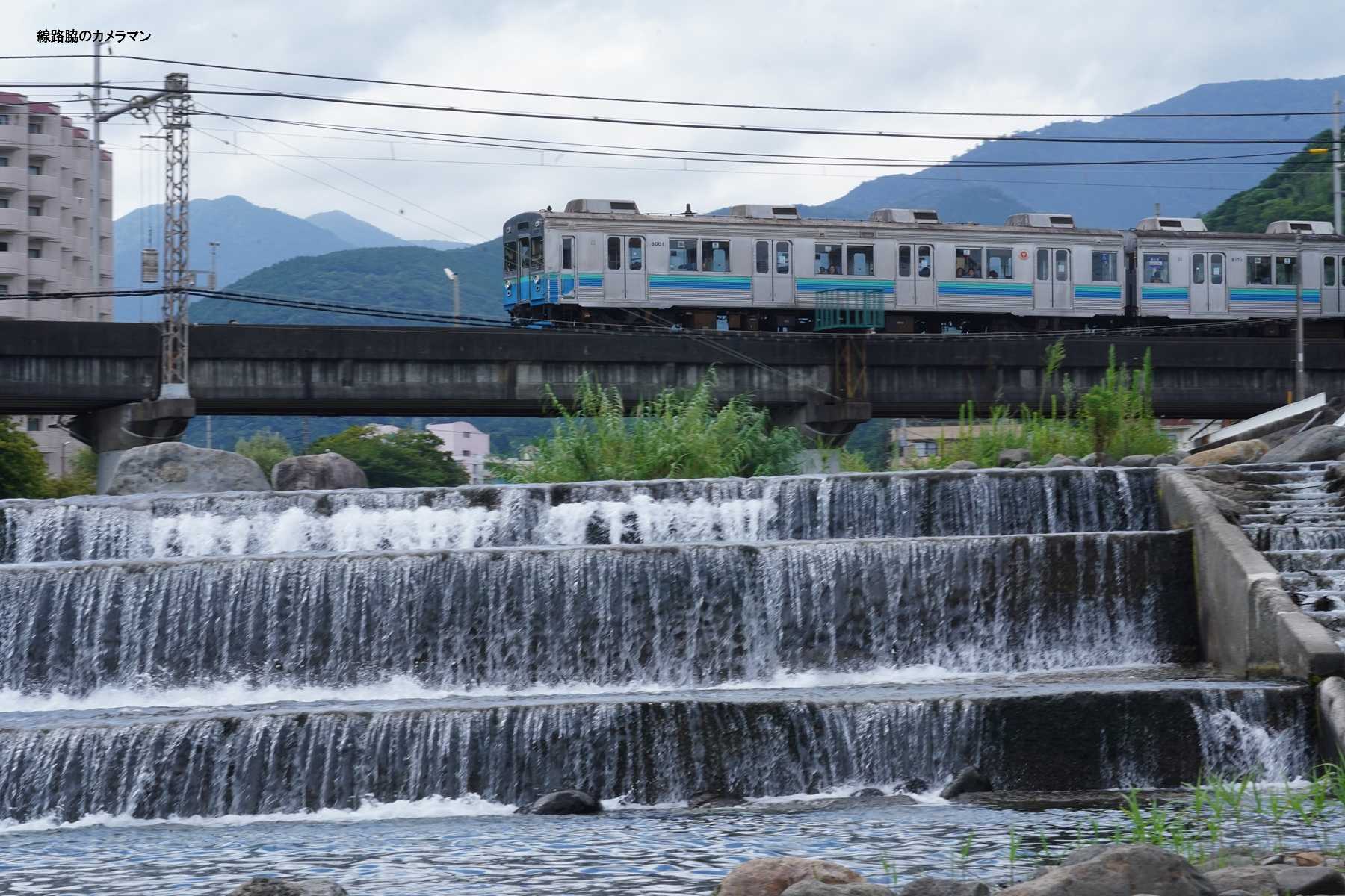 時間があるので、素足になり石に腰かけて川に足を付けて先行列車を撮影してみた。