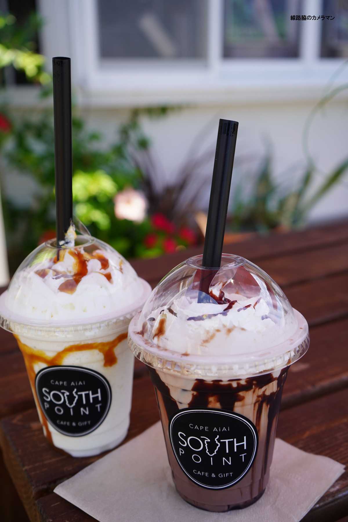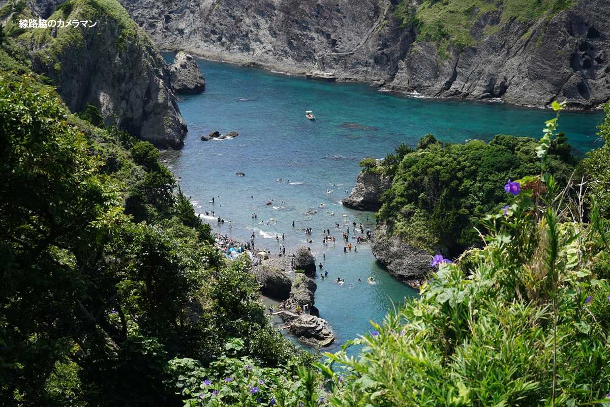 冷たいドリンクを持ちながら駐車場の下を見ると、今人気のシュノーケリングスポットとなっている「ヒリゾ浜」を除くことができる。