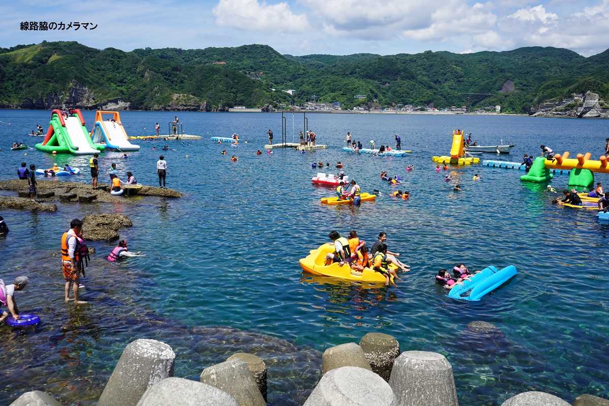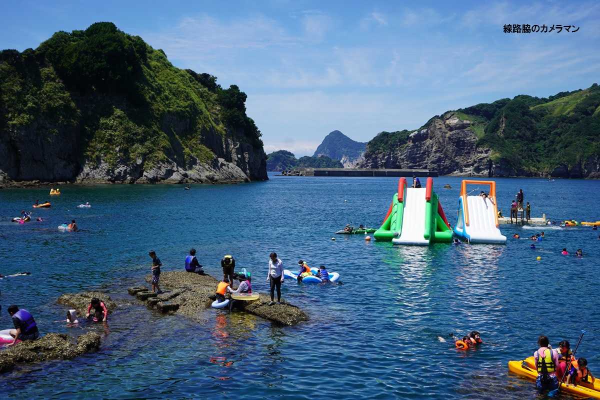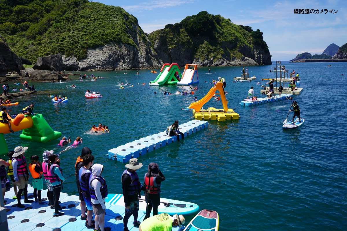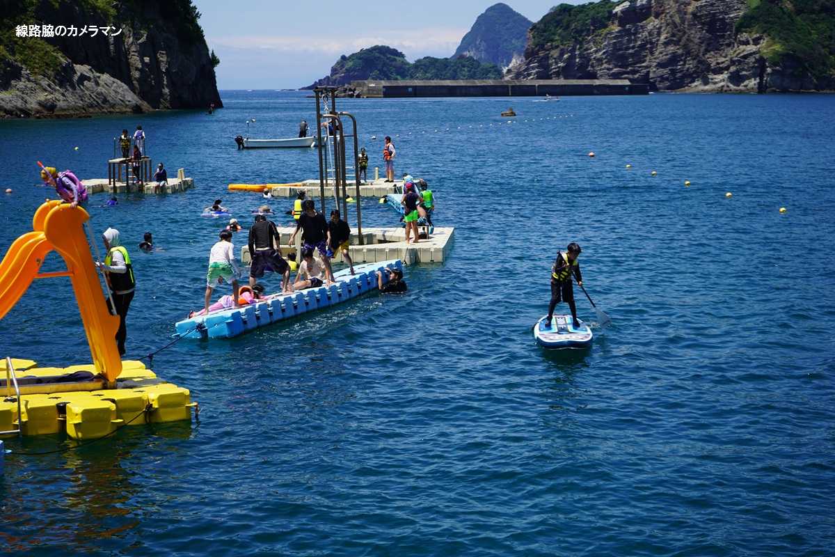 までは、入り江の中に大型の滑り台や浮き台を設けた「海上アスレチック」が用意されている。
