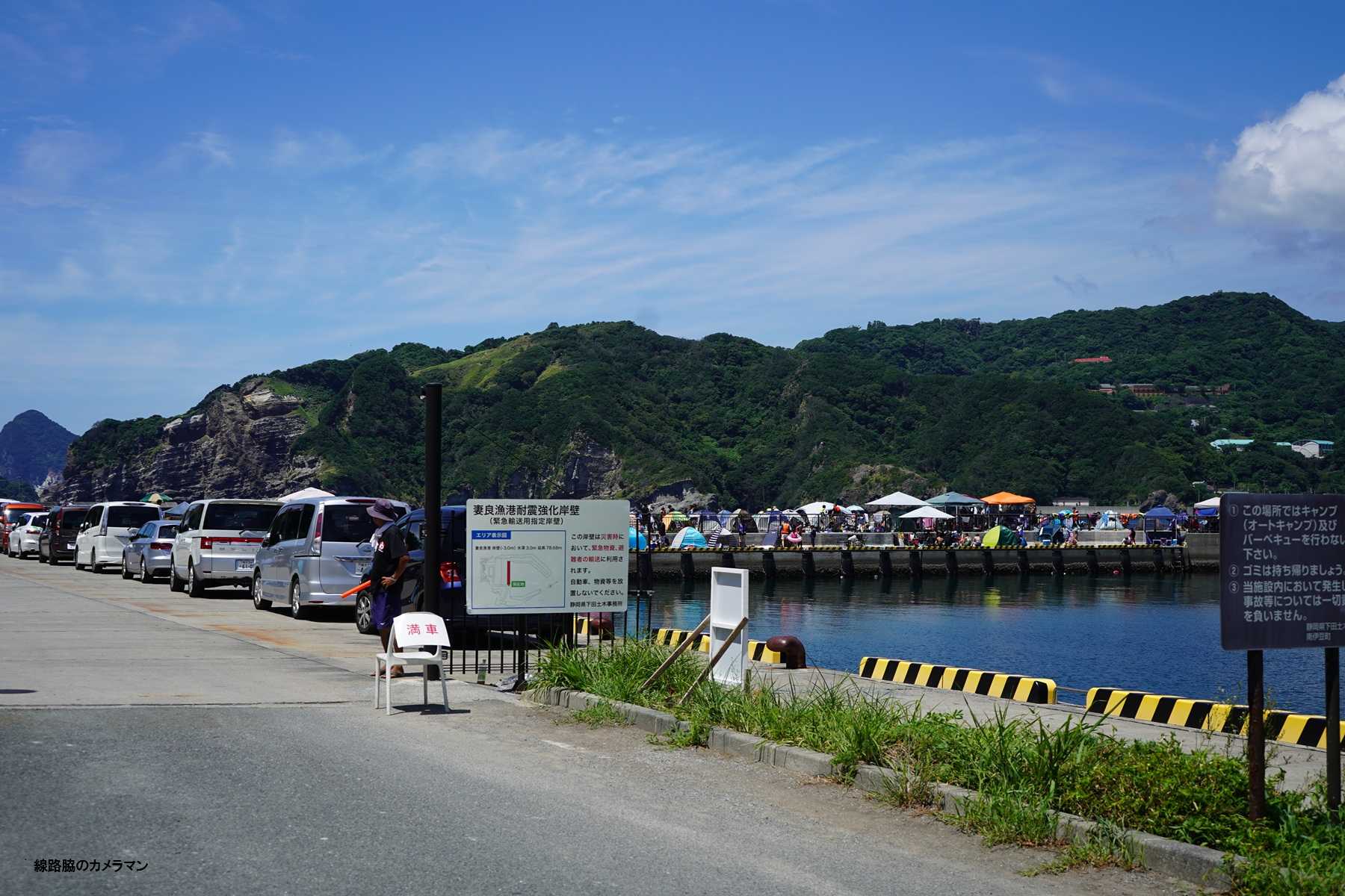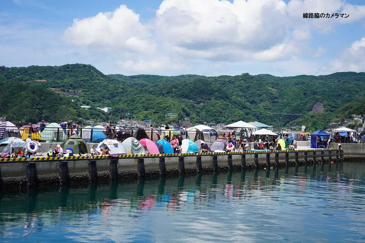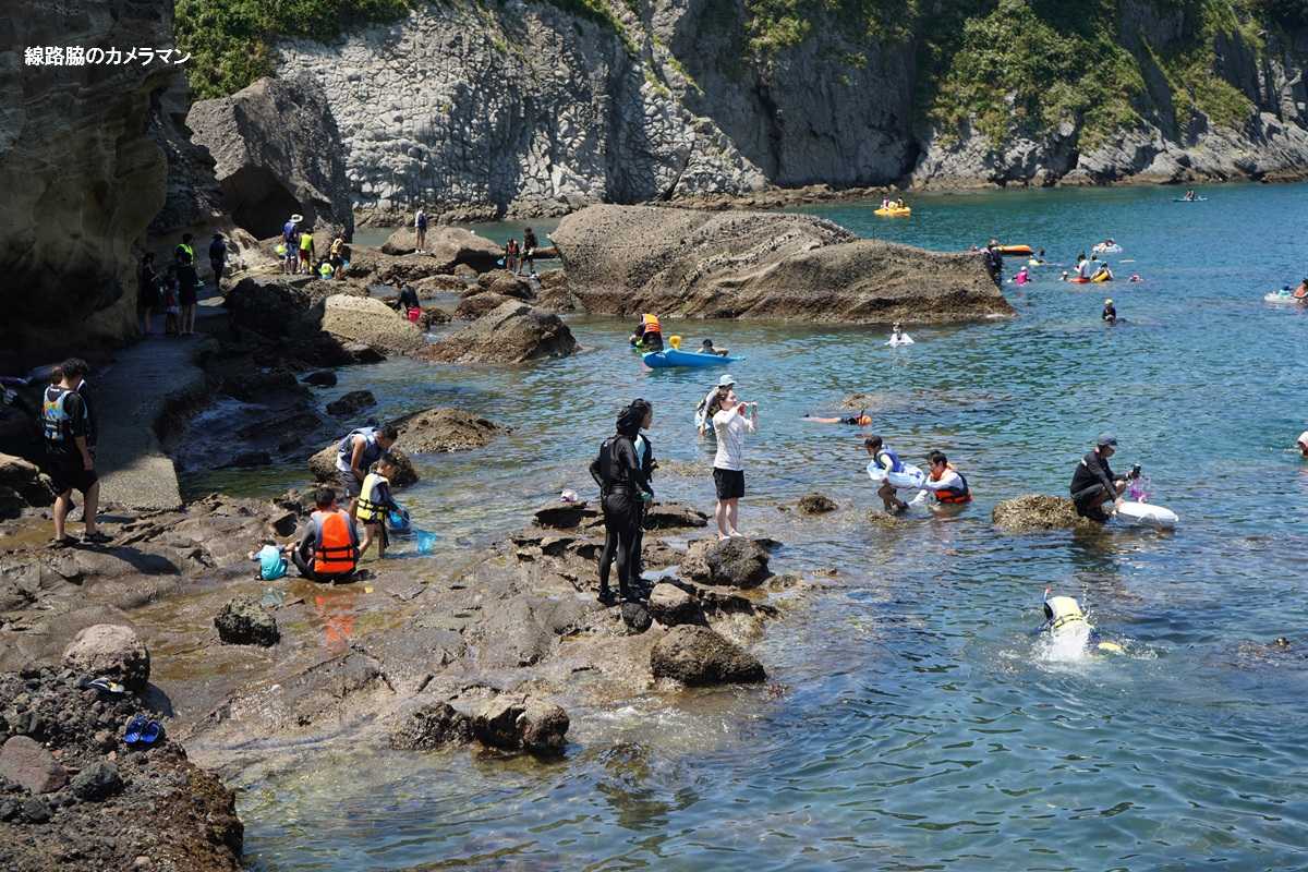 今日はすでに駐車場は満車で、堤防の上にもたくさんのテントが張られ、ライフジャケットを着た家族連れが磯遊びをしている。