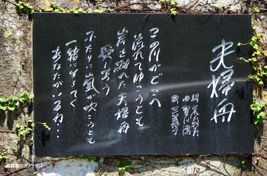 この漁港で働く夫婦をモデルに作られた演歌「夫婦舟」の歌碑。