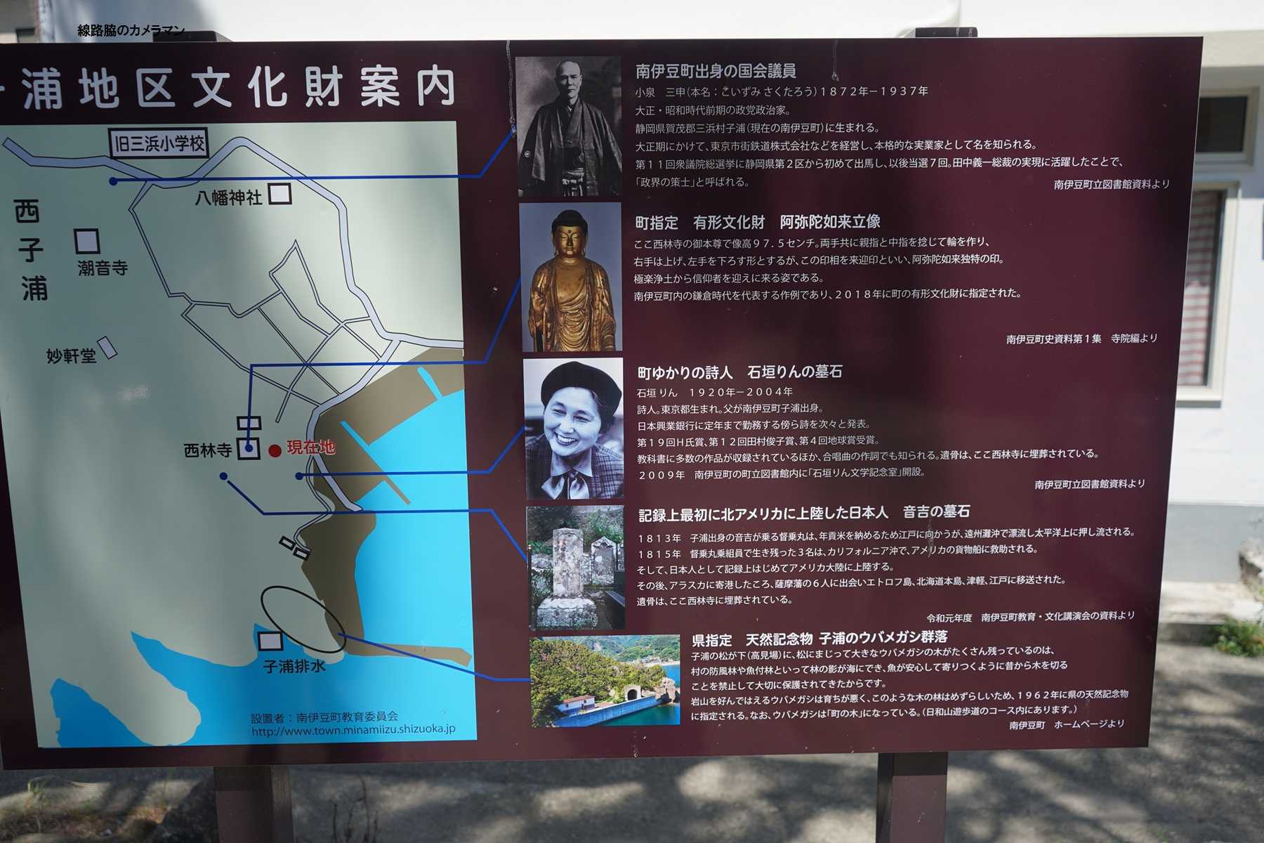 海辺のお寺西林寺の境内には、子浦出身の著名人の案内がある。