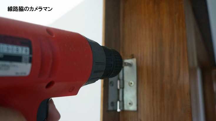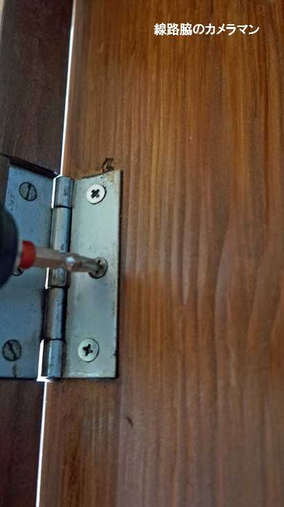 1枚は蝶番を外してテーブルの上で作業したが、もう一枚の蝶番のねじ頭がつぶれて取り外しができない。
