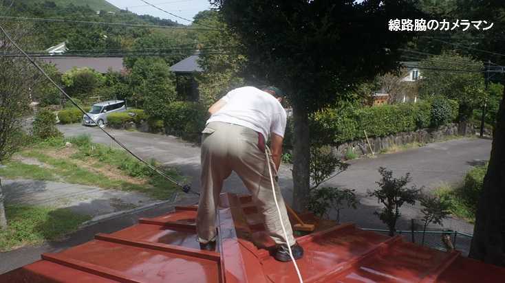 屋根から落ちて怪我をしないように、ロープで体を縛って命綱とした。